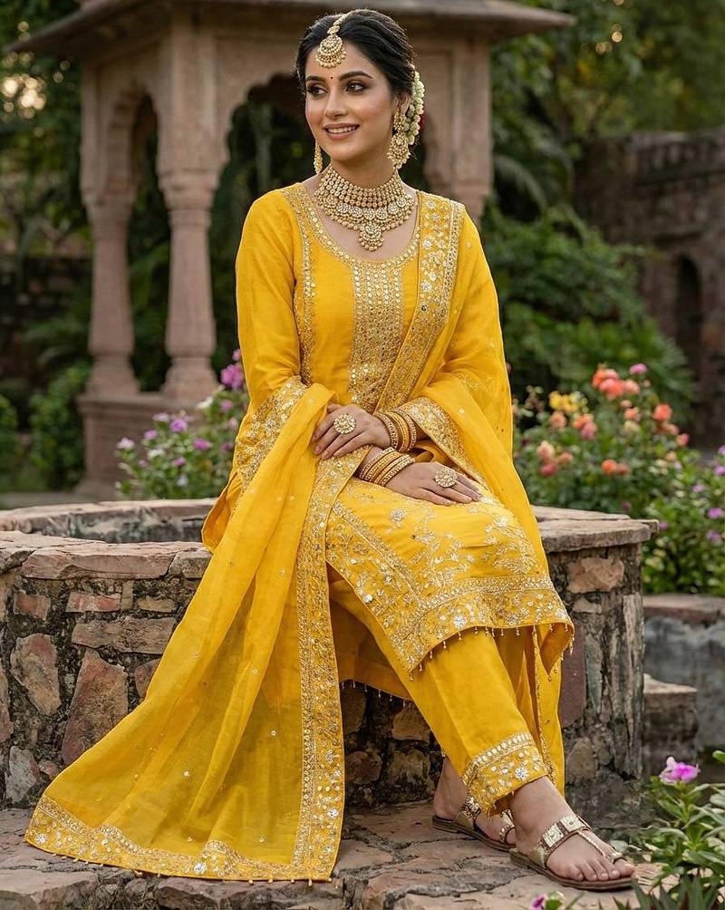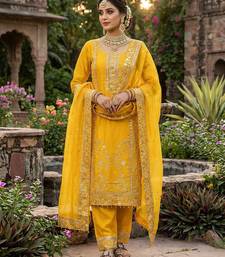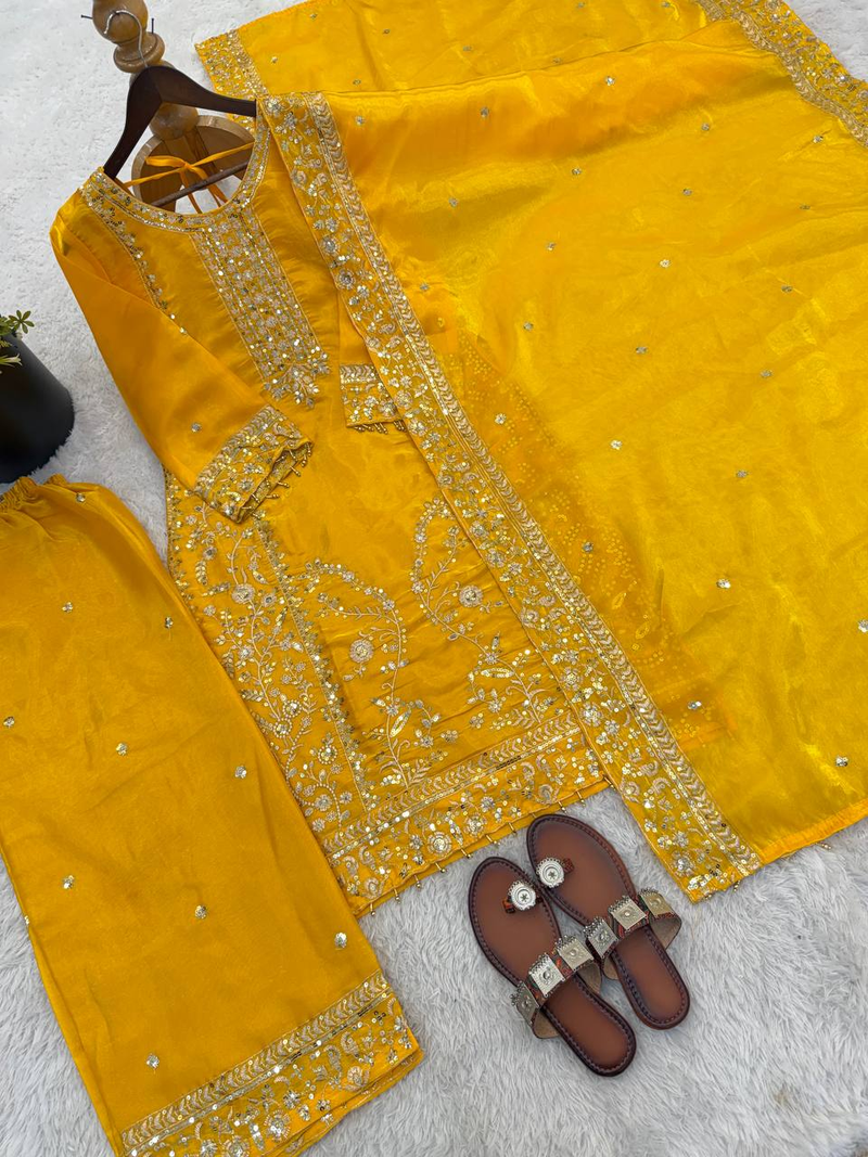 Yellow color designer pure gmy silk sequins embroidered work readymade suit stitched
