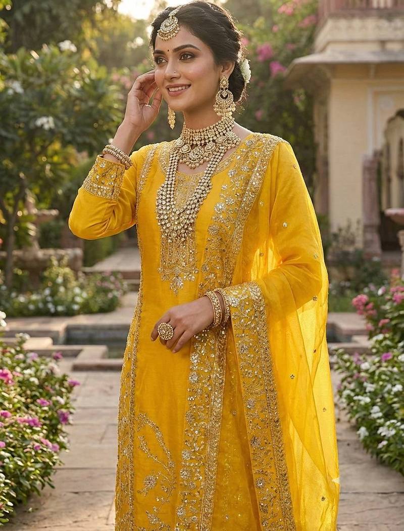| Product Name | Yellow Color Designer Pure Gmy Silk Sequins Embroidered Work Readymade Suit | |