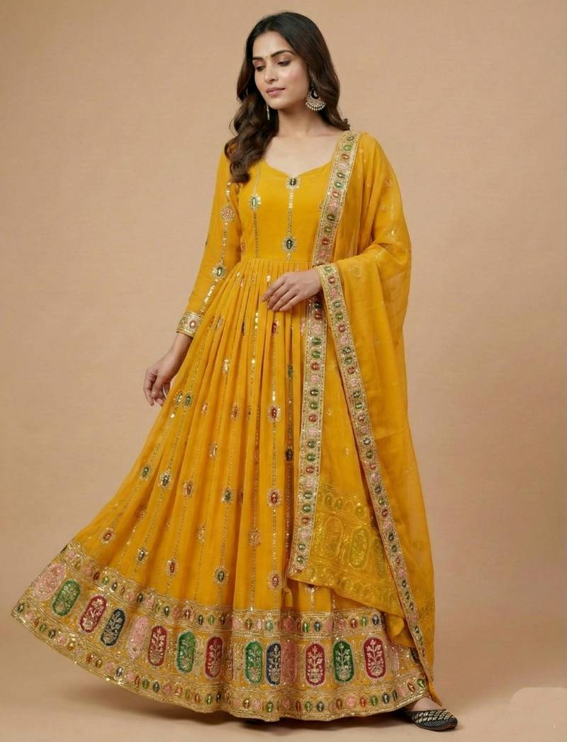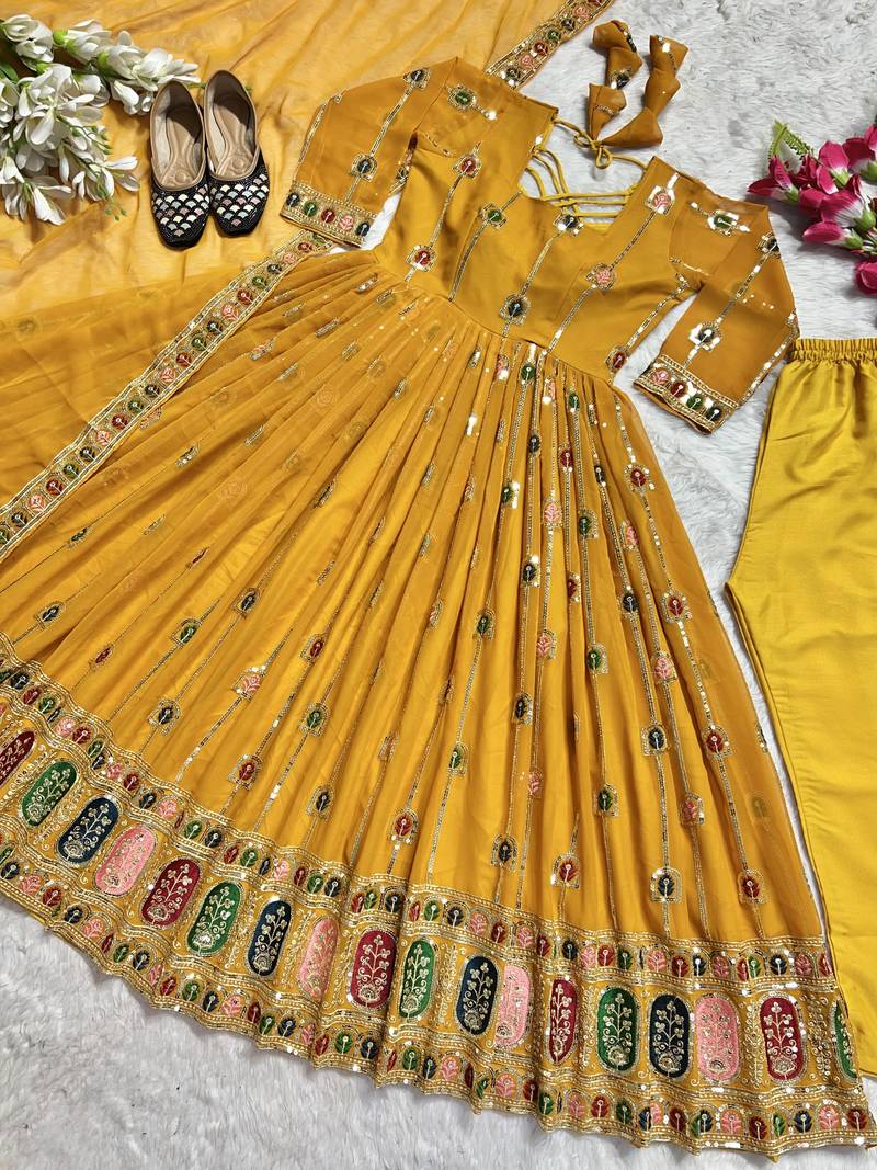Yellow designer heavy faux georgette sequins embroidered work readymade suit stitched