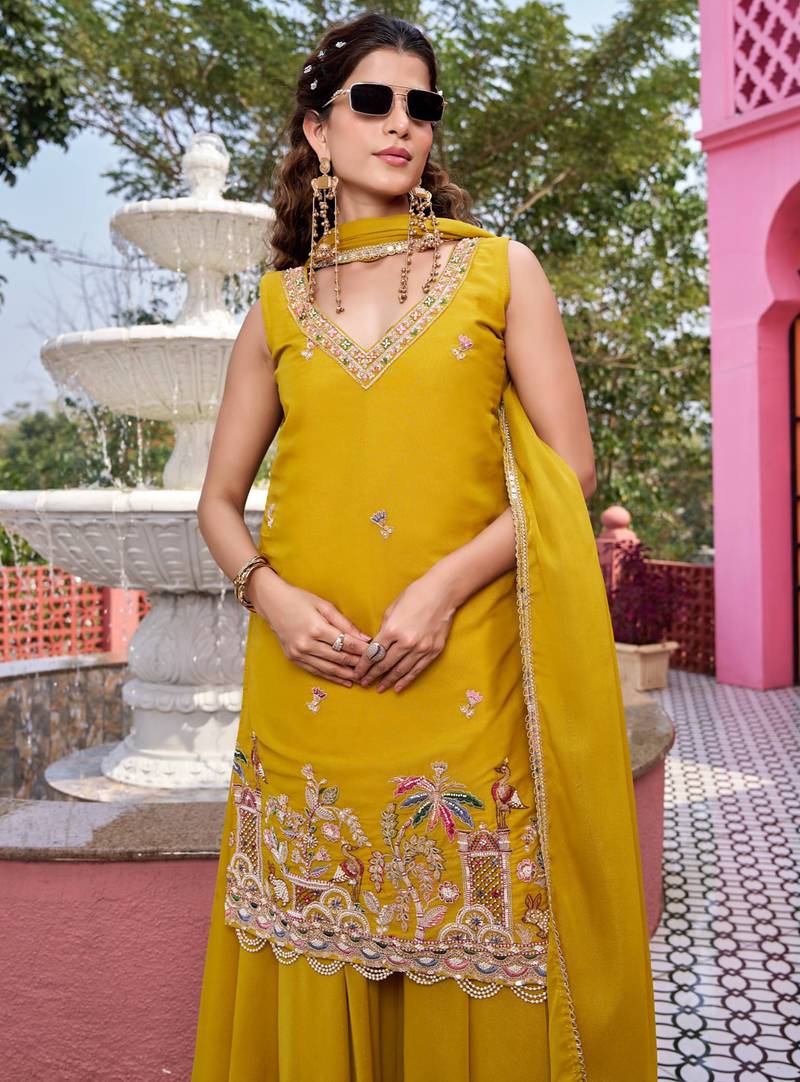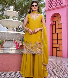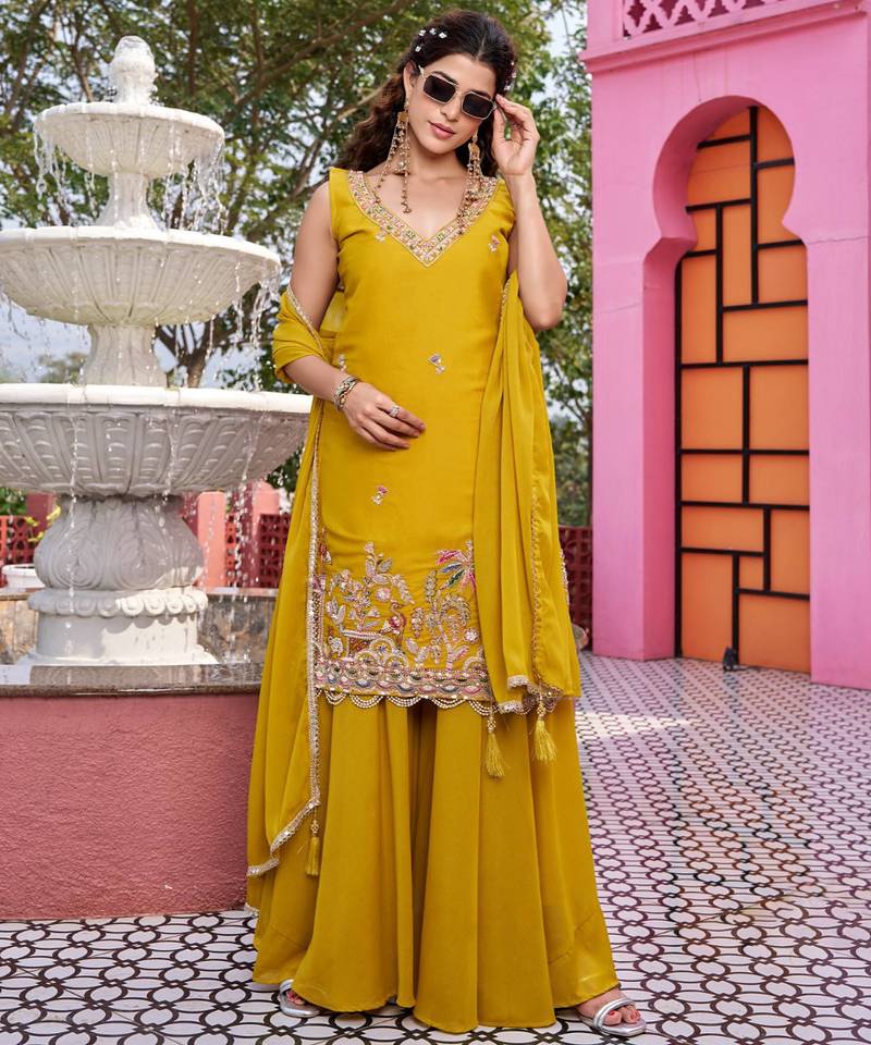 Yellow designer pure star georgette sequins embroidered work readymade suit stitched