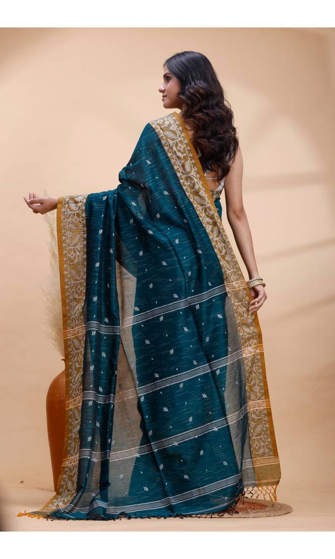 | Product Name | Dark Teal Green Handloom Cotton Saree With Mustard Yellow Heritage Border | |
