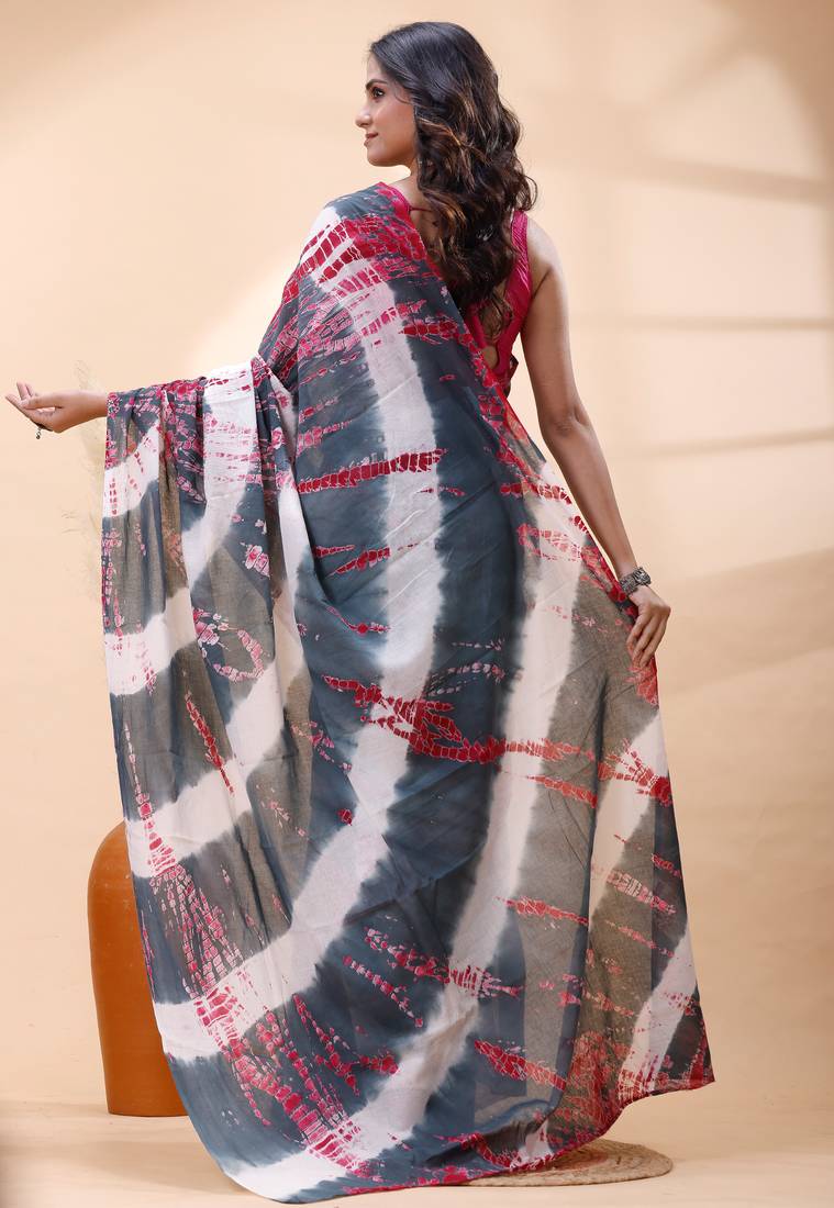 | Product Name | Gray Bagru Malmal Cotton Saree With White Shibori Patterns And Red Highlights | |