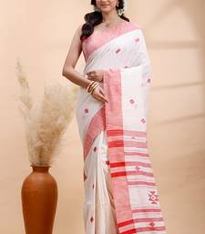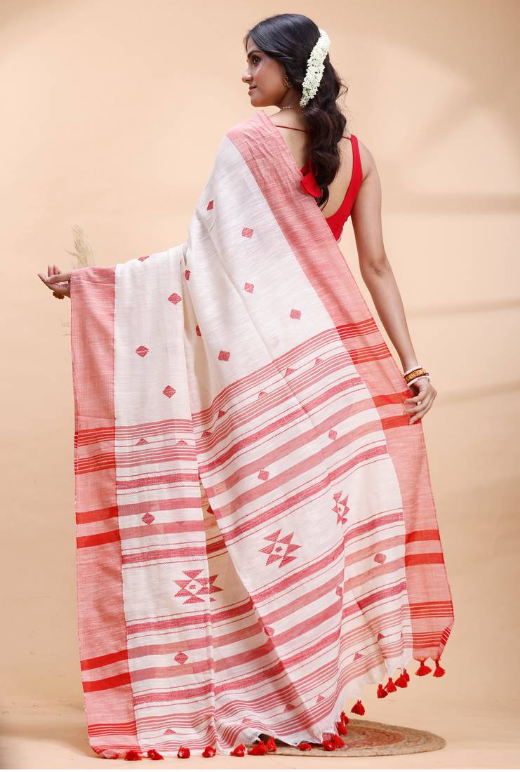 Offwhite & red handloom saree with minimalist woven motifs and classic contrast border
