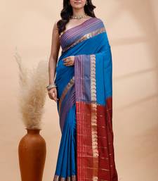 Royal blue kanjivaram silk saree with purple border & red zari pallu