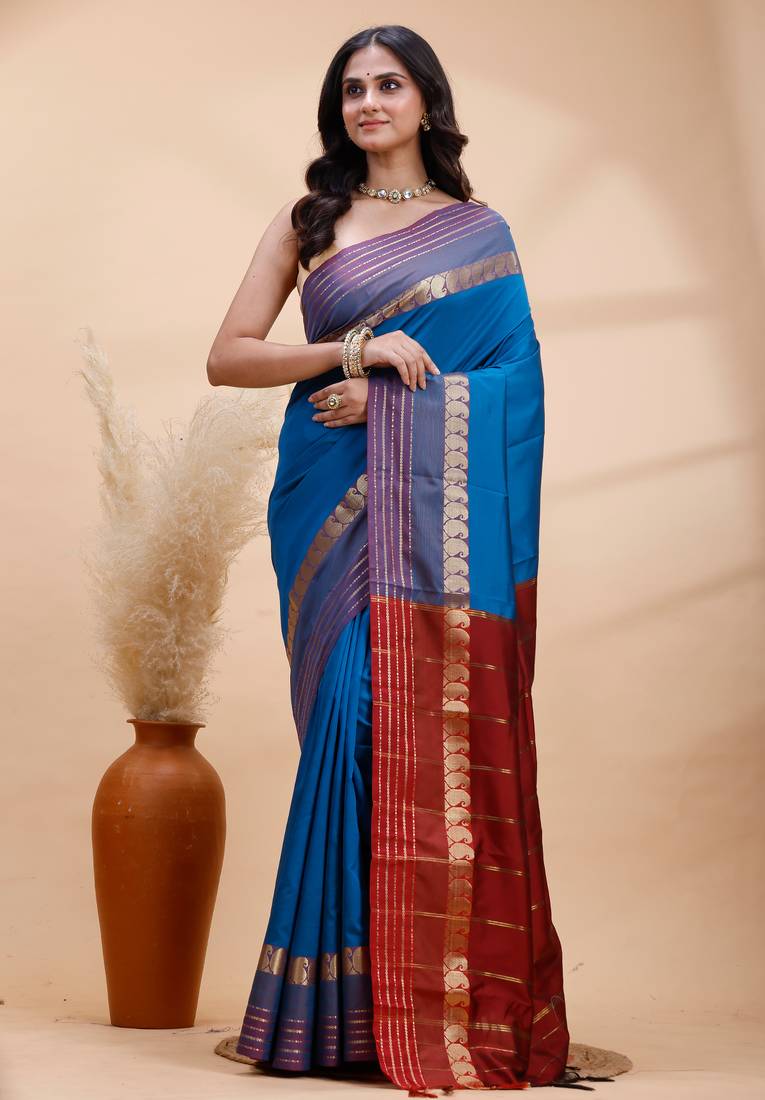 | Product Name | Royal Blue Kanjivaram Silk Saree With Purple Border & Red Zari Pallu | |