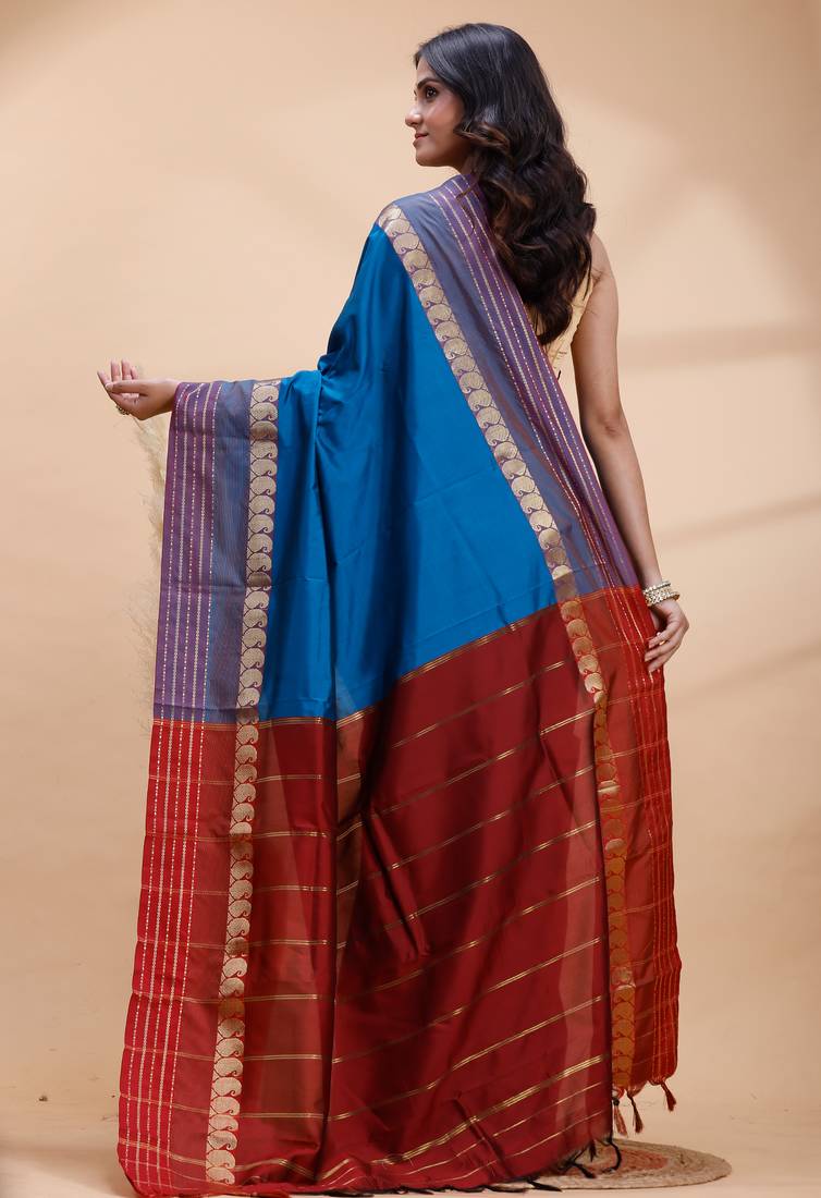| Product Name | Royal Blue Kanjivaram Silk Saree With Purple Border & Red Zari Pallu | |