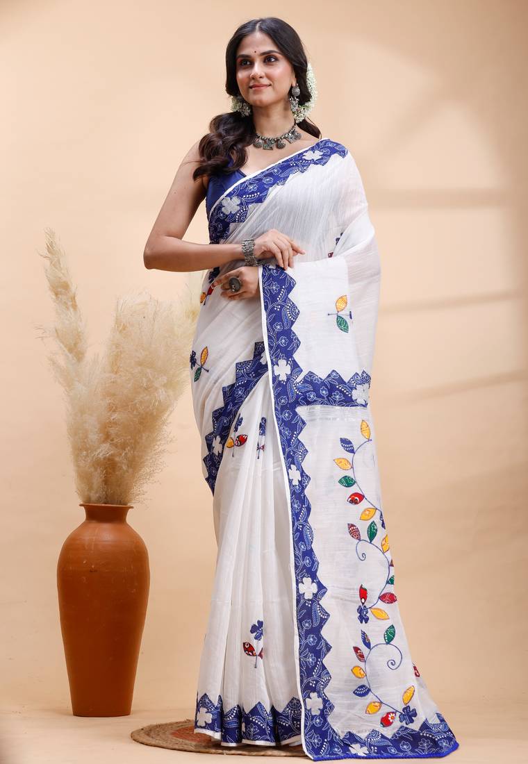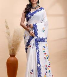 | Product Name | White & Blue Handloom Saree With Intricate Applique Work And Floral Artistic Border | |