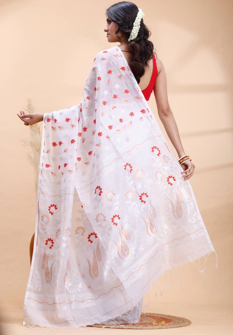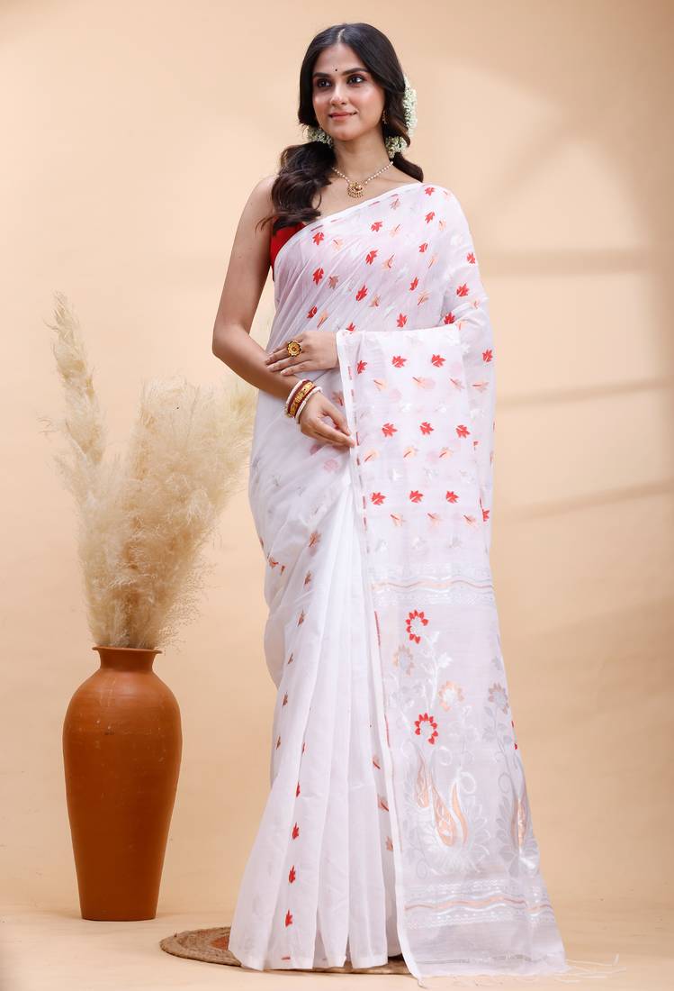 White handloom cotton saree with delicate red and golden floral buti and artistic woven pallu