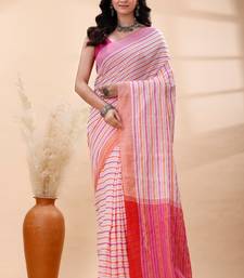 White handloom cotton saree with pink and orange fine striped weave and traditional border