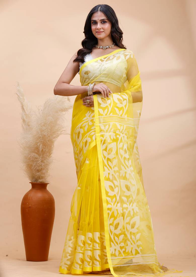 | Product Name | Yellow And White Muslin Saree With Delicate Jamdani Motifs And Self Border | |