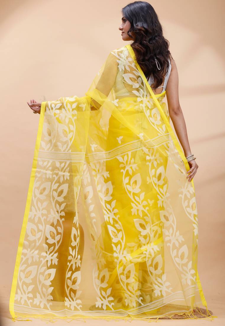 Yellow and white muslin saree with delicate jamdani motifs and self border
