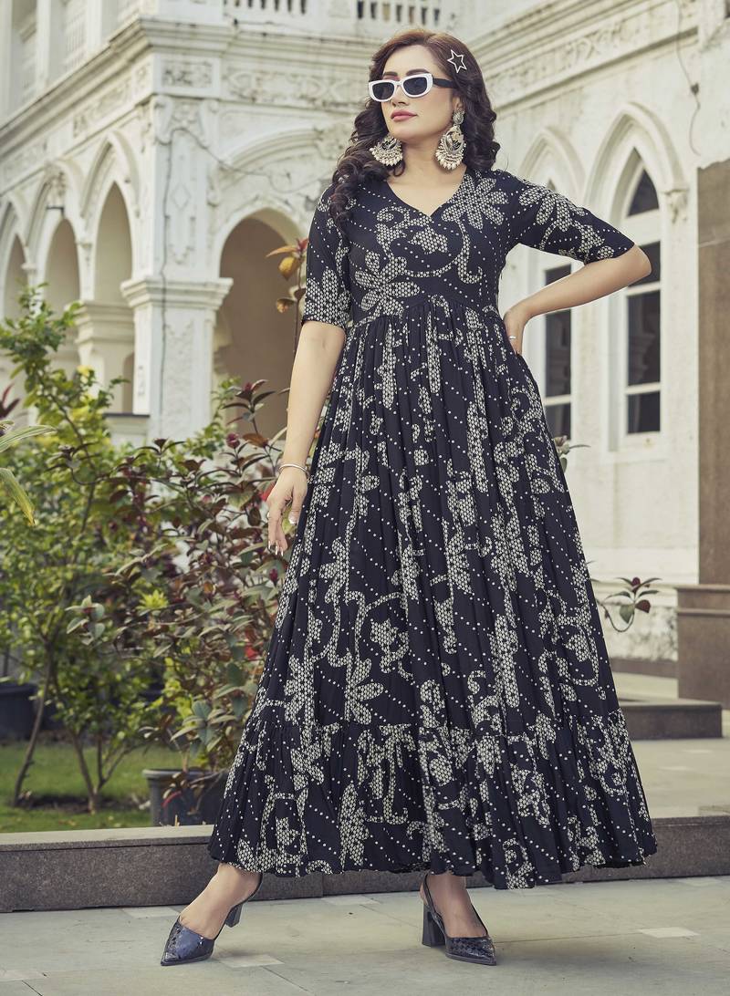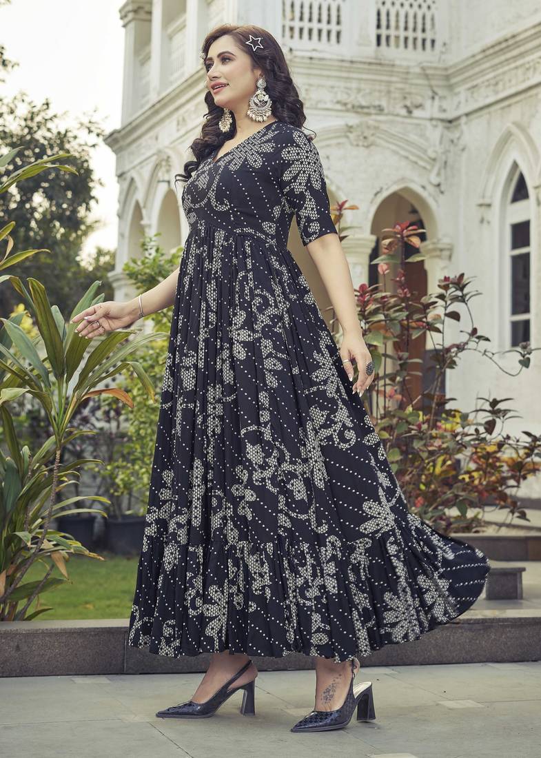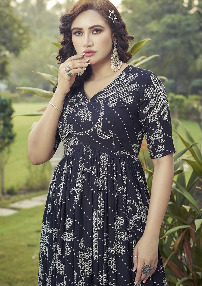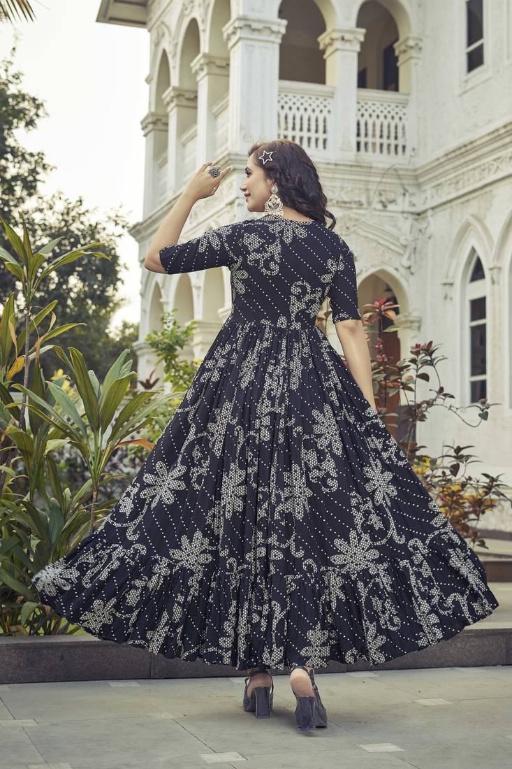 | Product Description | Make A Bold Yet Elegant Statement With This Stunning Black Floral Printed Anarkali Maxi Dress. Designed With Intricate White Floral And Dotted Motifs All Over, This Outfit Beautifully Blends Traditional Charm With Contemporary Grace.The Fitted Empire Style Bodice Enhances The Silhouette, While The Gathered Tiers Create A Dramatic, Voluminous Flare That Moves Gracefully With Every Step. Crafted From Soft And Breathable Fabric, This Dress Ensures Comfort Without Compromising On Style. |