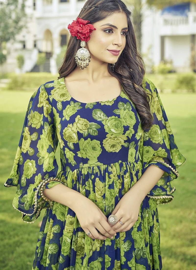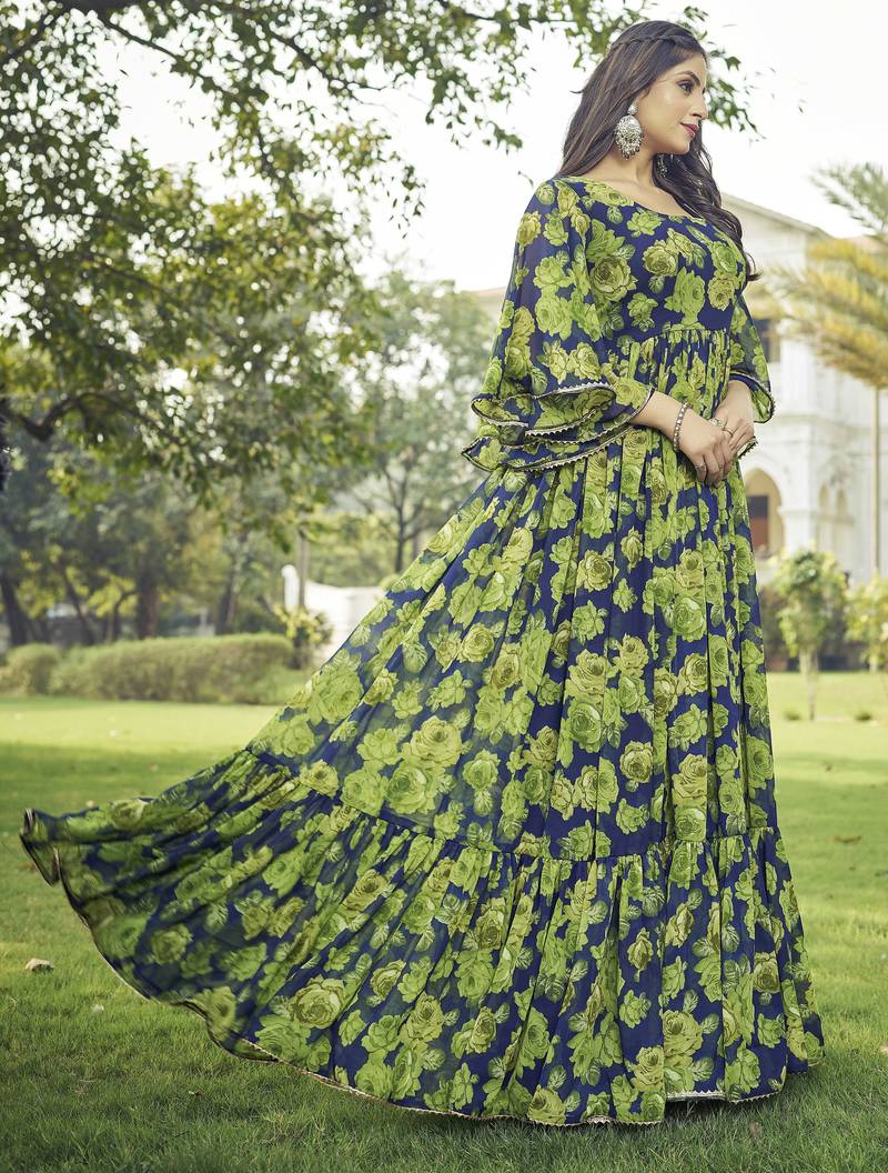| Product Description | Make A Graceful Style Statement With This Stunning Green Floral Printed Anarkali Gown. Crafted From Lightweight, Flowy Fabric, This Gown Features An All Over Rose Floral Print On A Rich Green Base, Giving It A Fresh And Elegant Appeal. The Round Neckline And Fitted Bodice Beautifully Complement The Flared Silhouette, While The Layered Panels Add Volume And Movement. The Highlight Of This Gown Is Its Dramatic Flared Bell Sleeves, Which Enhance The Overall Charm And Provide A Contemporary Ethnic Touch. Perfect For Festive Occasions, Daytime Celebrations, Parties, Or Casual Ethnic Gatherings, This Anarkali Offers Both Comfort And Sophistication. |