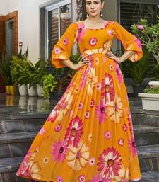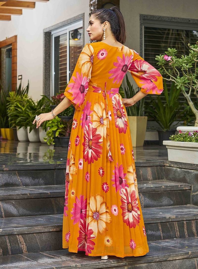 Brighten Up Your Ethnic Wardrobe With This Stunning Mustard Colour Floral Printed Anarkali Dress, Designed To Offer Effortless Elegance And Comfort. Crafted From Lightweight And Flowy Fabric, This Dress Features A Beautifully Flared Silhouette That Moves Gracefully With Every Step. The Vibrant Floral Print In Contrasting Hues Adds A Fresh And Lively Appeal, Making It Perfect For Festive Occasions, Daytime Functions, Casual Celebrations, And Special Gatherings. Styled With A Flattering Square Neckline And Three Quarter Length Sleeves, It Enhances The Overall Look While Ensuring All Day Comfort. The Gathered Waistline Creates A Graceful Shape, Giving The Outfit A Feminine And Timeless Charm. Pair It With Minimal Jewellery And Traditional Footwear To Complete A Sophisticated Ethnic Look Suitable For Both Casual And Festive Wear.