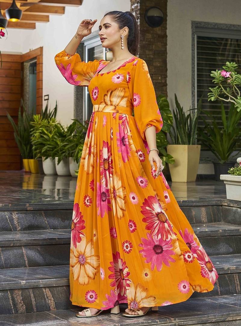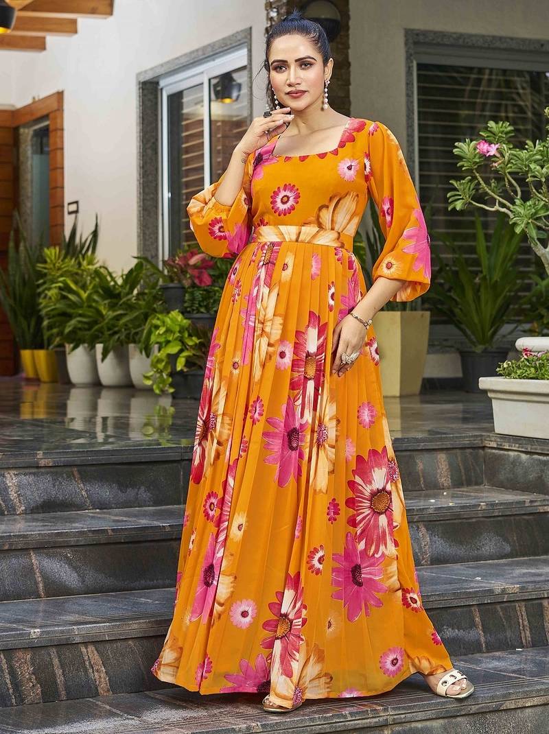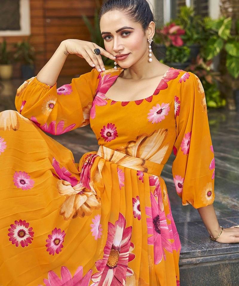 Women Mustard All Over Floral Print Georgette Fit & Flare Gown