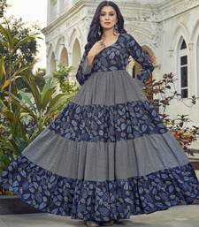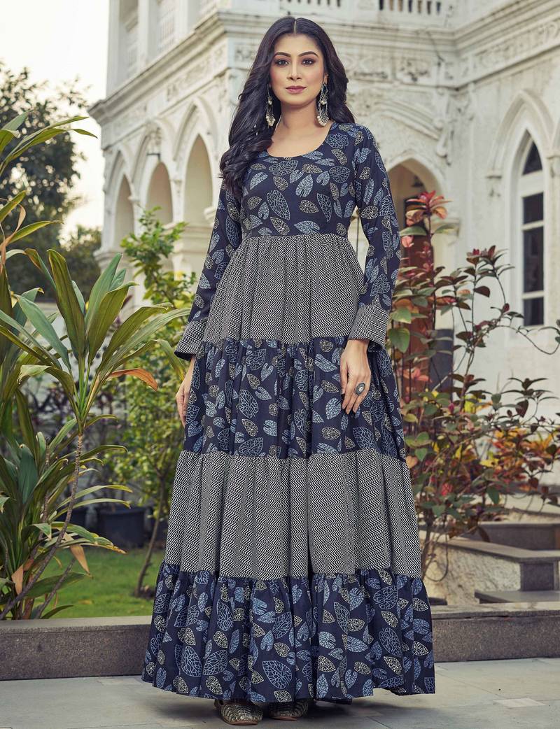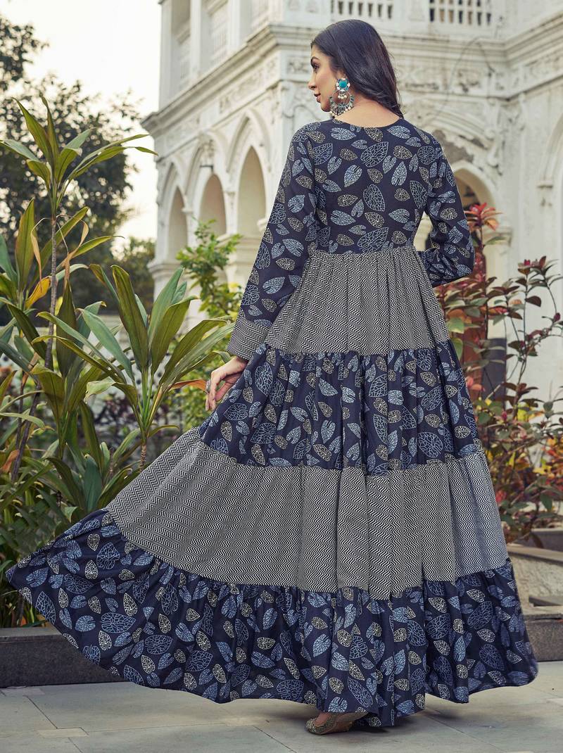 | Product Name | Women Navy Blue Leaf Printed Tiered Anarkali Maxi Dress | |