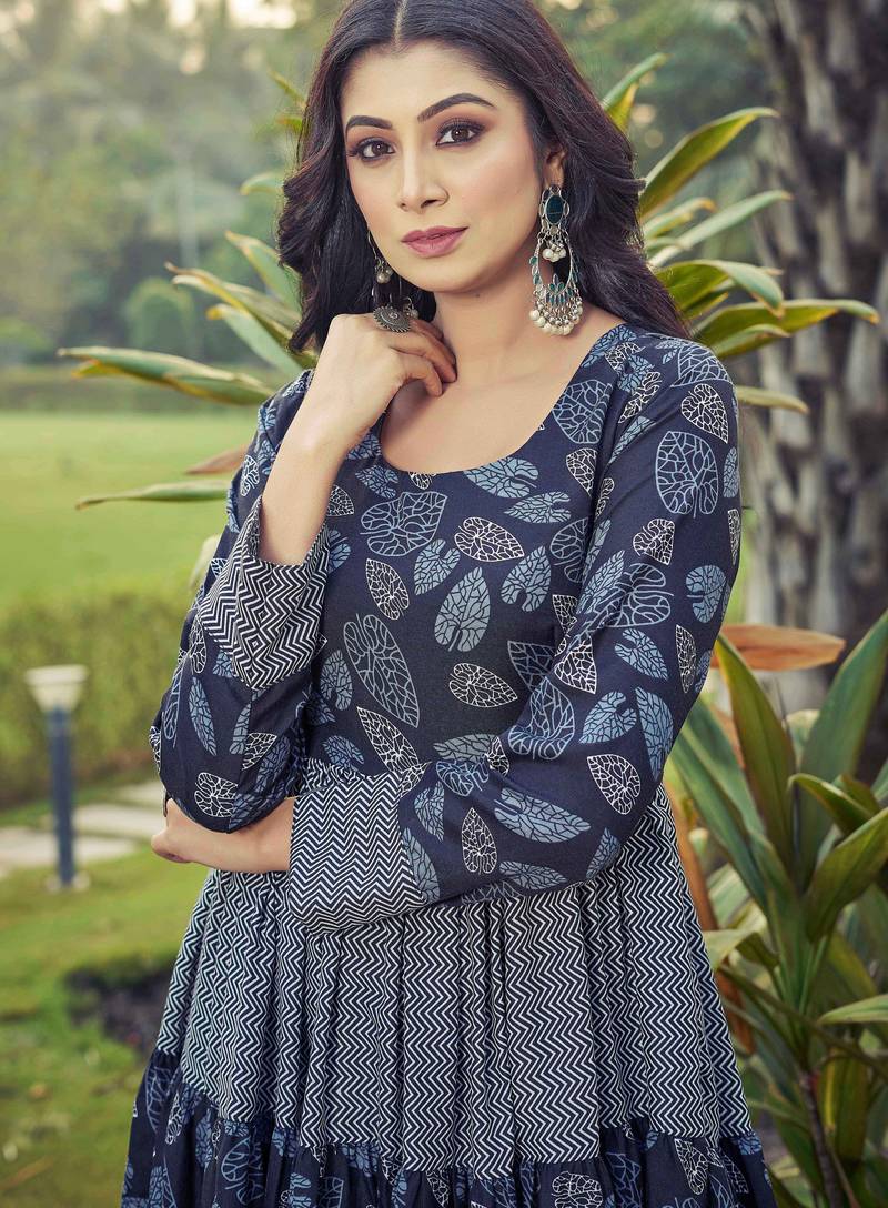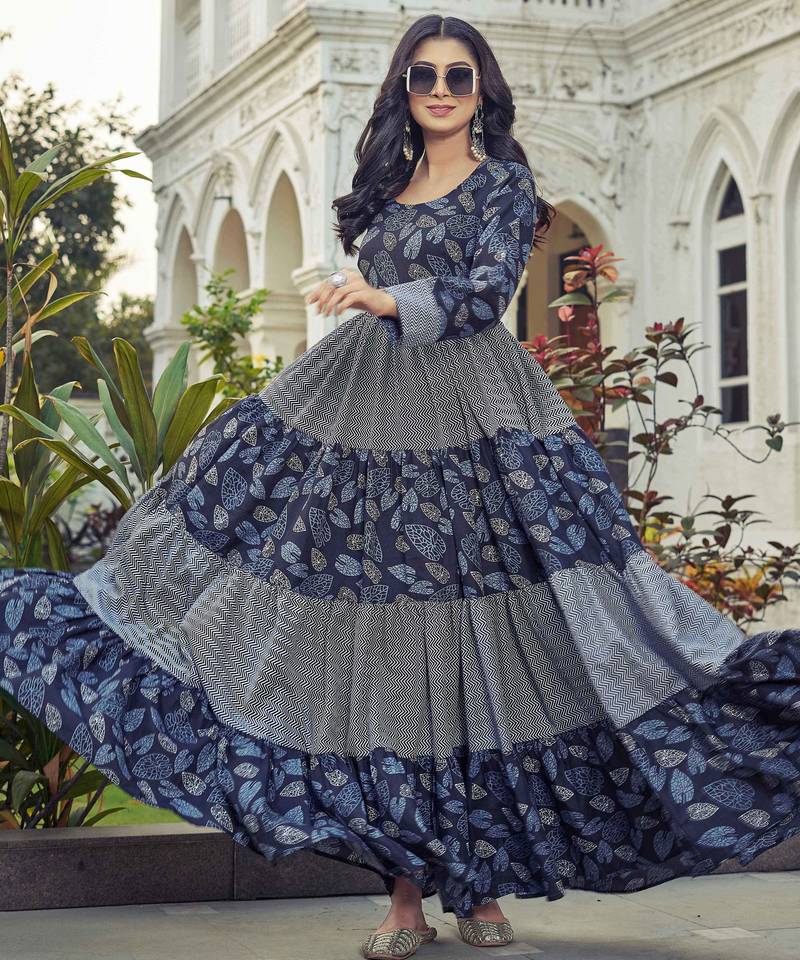 | Product Description | Make A Graceful Statement With This Elegant Navy Blue Leaf Printed Anarkali Maxi Dress. Designed With A Beautifully Structured Tiered Silhouette, This Dress Features Alternating Patterned Panels That Enhance Its Volume And Create A Stunning Flare.Crafted From Soft And Breathable Fabric, It Ensures All Day Comfort While Maintaining A Rich Ethnic Appeal. The Fitted Bodice Flows Into Layered Gathered Panels, Giving It A Regal And Festive Look. Perfect For Festive Celebrations, Family Functions, Cultural Events, And Evening Gatherings. |