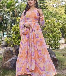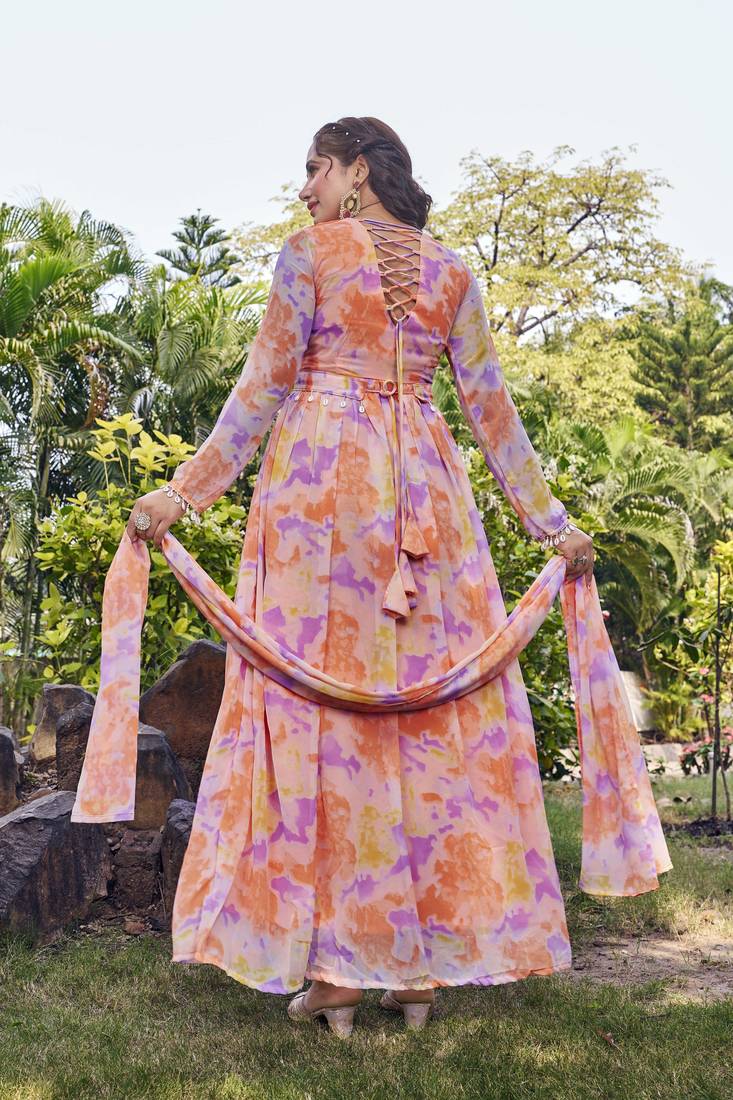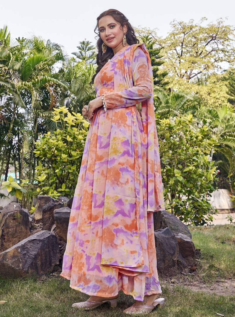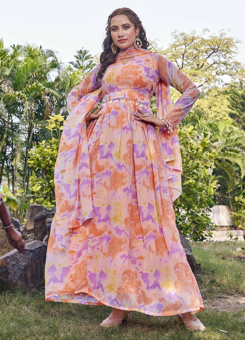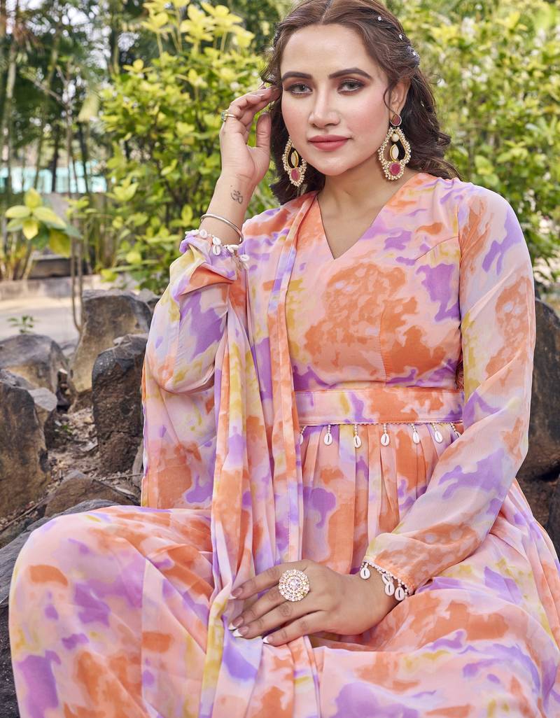 Step Into Effortless Elegance With This Stunning Peach Hued Anarkali Gown, Designed To Make A Graceful Statement. Crafted In A Soft, Flowy Fabric, The Outfit Features A Delicate Pastel Print In Soothing Shades Of Peach, Lilac, And Soft Yellow That Adds A Fresh And Modern Touch. The Gown Is Styled With A Flattering V Notch Neckline And Full Length Sleeves, Beautifully Complemented By A Matching Dupatta That Drapes Effortlessly. Subtle Detailing At The Waist Enhances The Silhouette, While The Voluminous Flared Skirt Creates A Regal And Feminine Appeal. Perfect For Festive Celebrations, Daytime Weddings, Or Special Occasions, This Peach Anarkali Blends Comfort With Timeless Charm. Pair It With Minimal Jewelry And Soft Makeup For An Elegant, Polished Look.