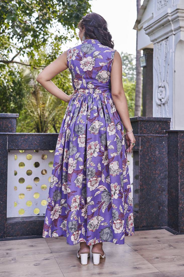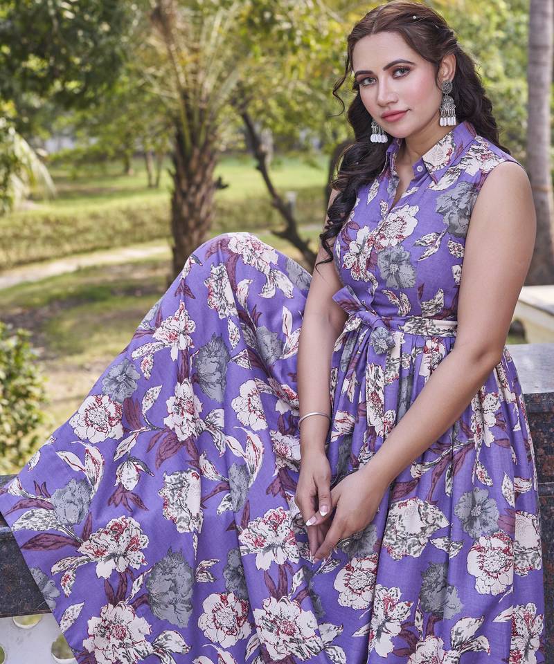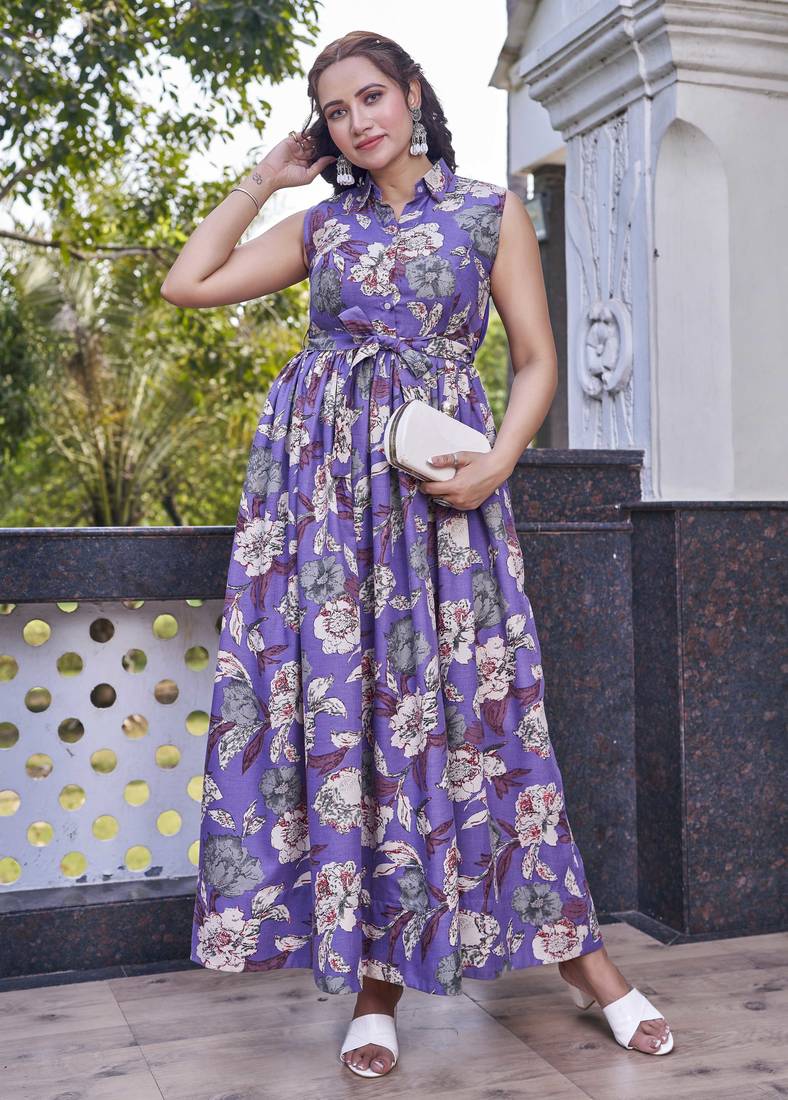 | Product Description | Add A Refreshing Touch Of Elegance To Your Wardrobe With This Purple Floral Long Dress, Designed For Effortless Day To Evening Styling. Made From Soft, Breathable Fabric, This Dress Features A Vibrant All Over Floral Print That Enhances Its Graceful Appeal. The Sleeveless Silhouette Is Paired With A Smart Collared Neckline And A Front Button Placket, Giving It A Contemporary Yet Feminine Look. A Matching Fabric Tie Up At The Waist Offers A Flattering Fit, While The Flared Hemline Ensures Comfort And Fluid Movement. Perfect For Brunches, Casual Outings, Or Holiday Wear, This Dress Blends Comfort With Chic Style. |