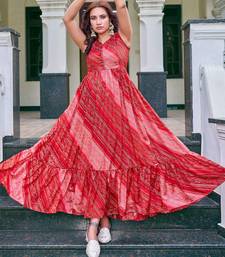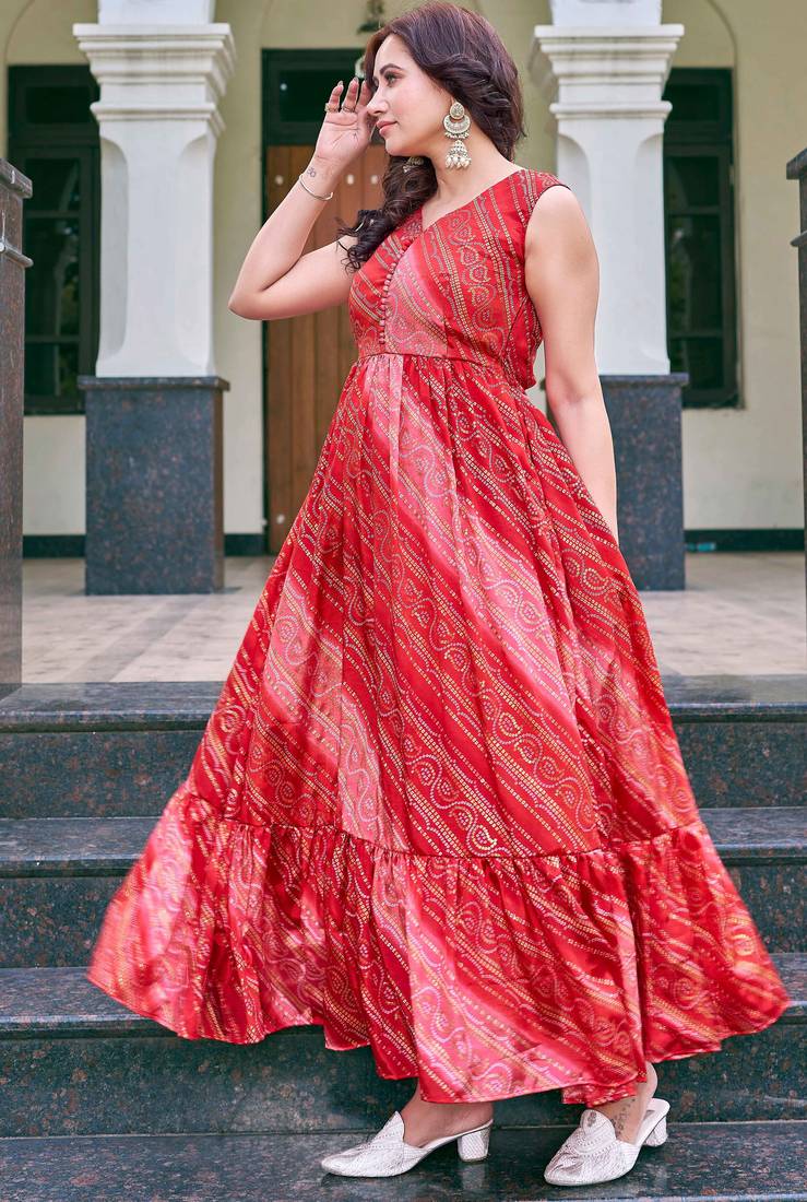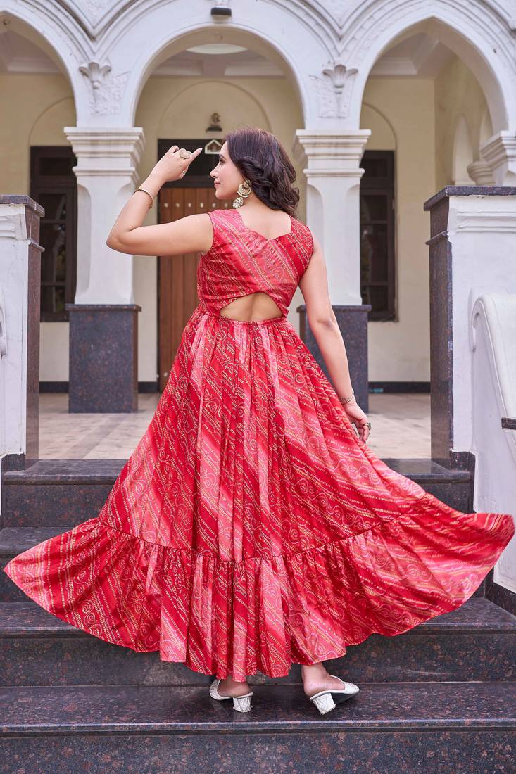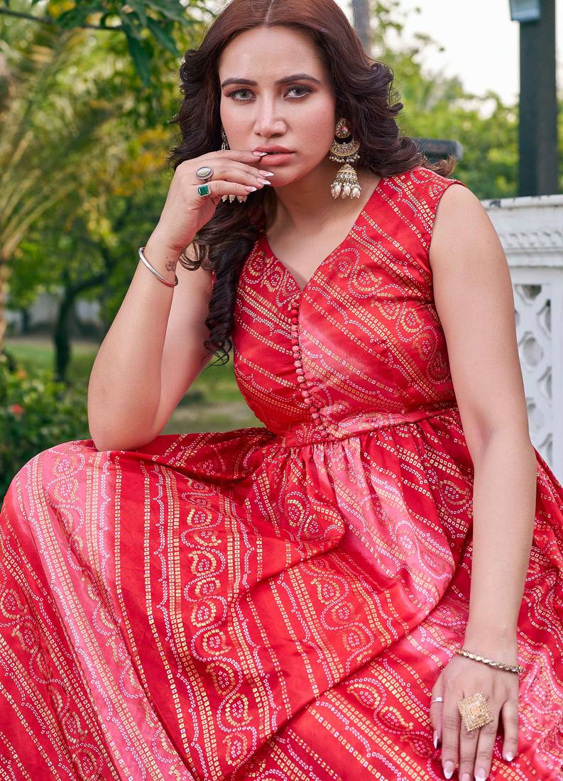 | Product Name | Women Red Bandhani Printed Pleated Anarkali Gown | |