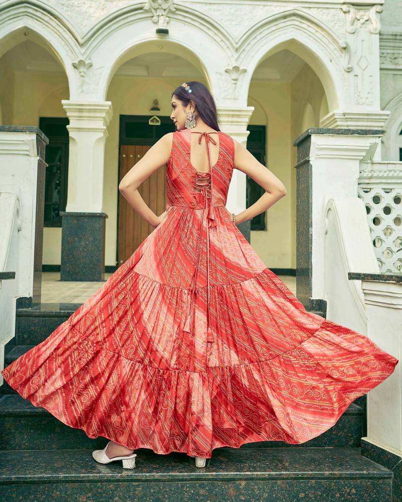 Women rust bandhani printed pleated anarkali gown