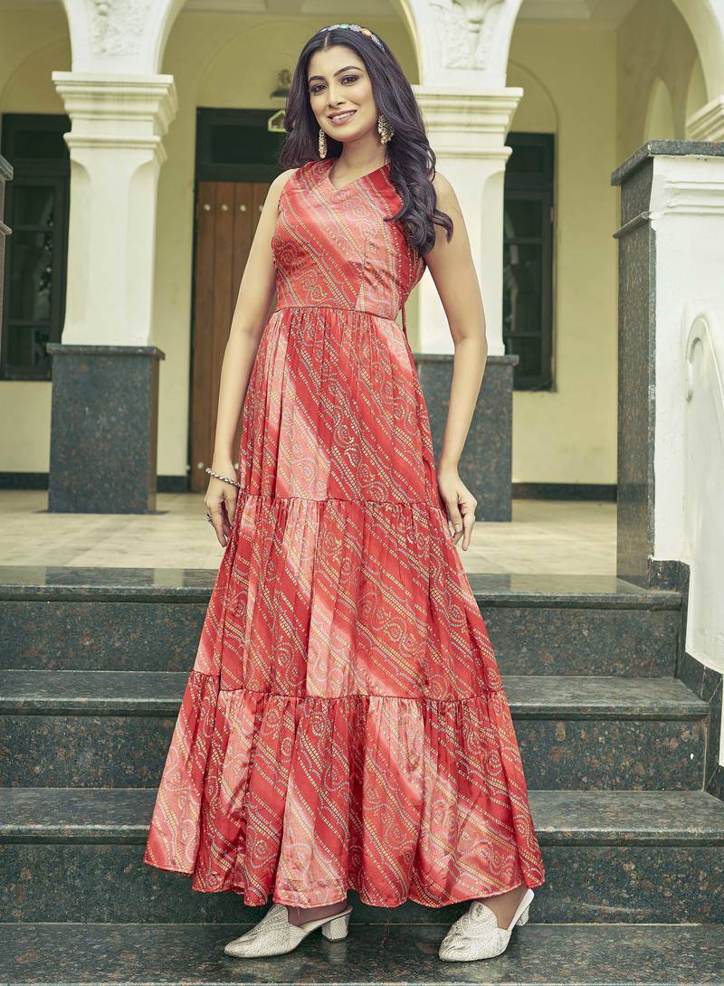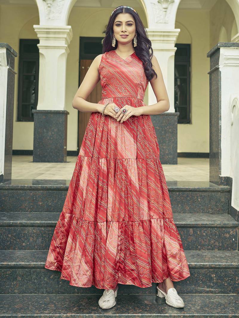 | Product Description | Add Vibrant Elegance To Your Ethnic Collection With This Graceful Red Bandhani Printed Tiered Anarkali Kurta Dress. Designed With A Flattering Gathered Silhouette, This Sleeveless Piece Features A Classic Round Neckline And Multi Tier Flare That Enhances Movement And Comfort. The Traditional Bandhani Inspired Print Adds A Festive Charm, Making It Perfect For Casual Outings, Daytime Functions, And Ethnic Wear Styling. Pair It With Statement Earrings And Ethnic Footwear For A Complete Traditional Look. |