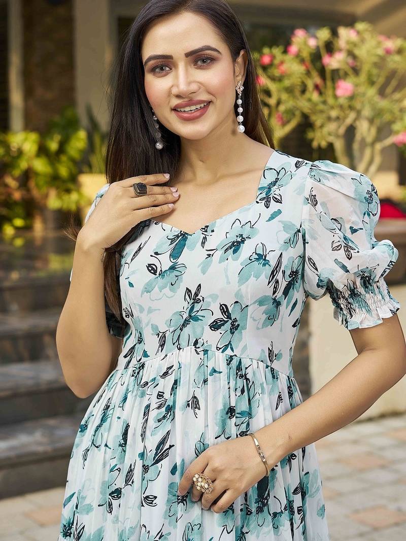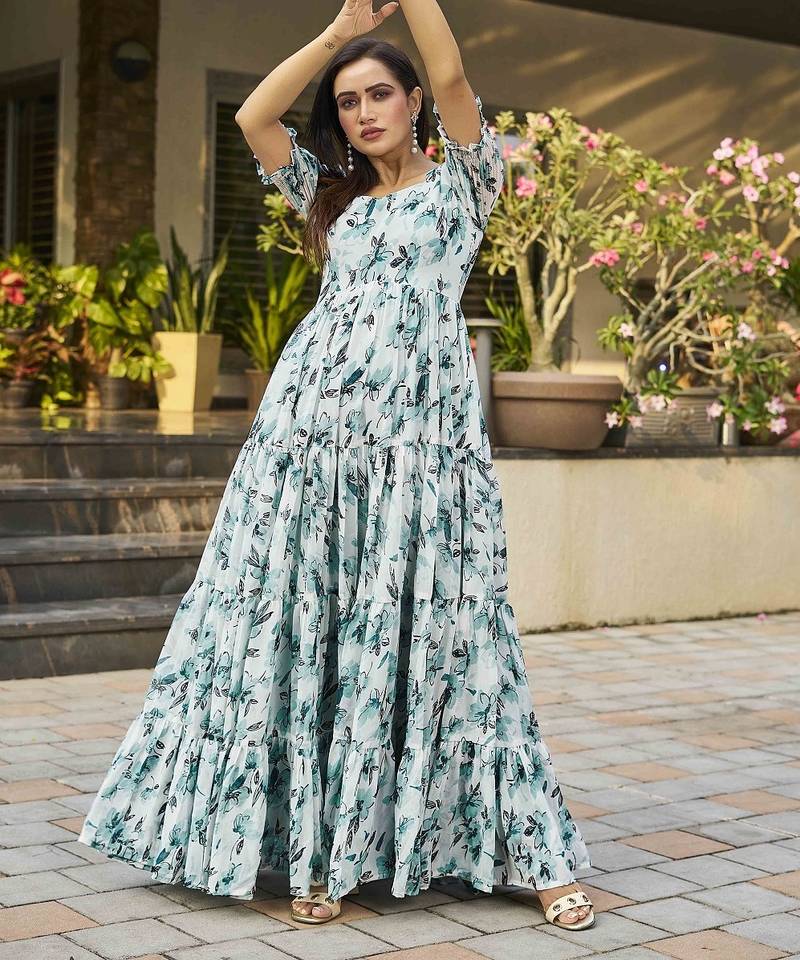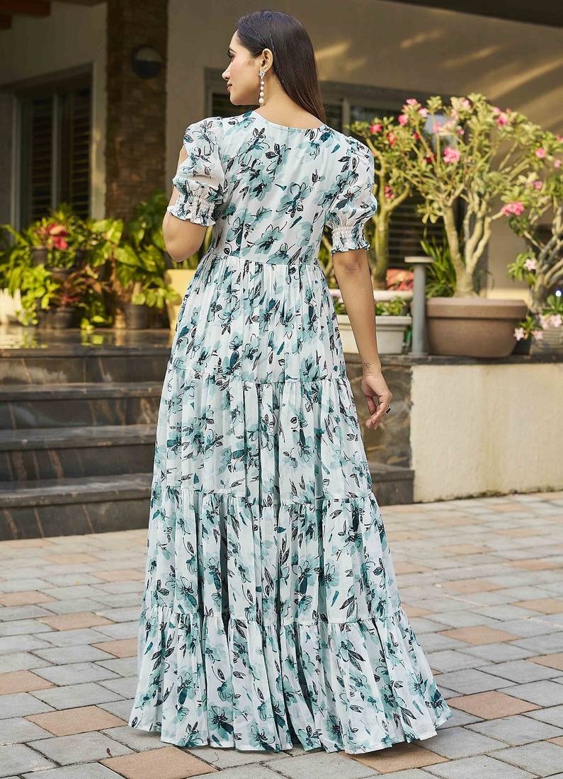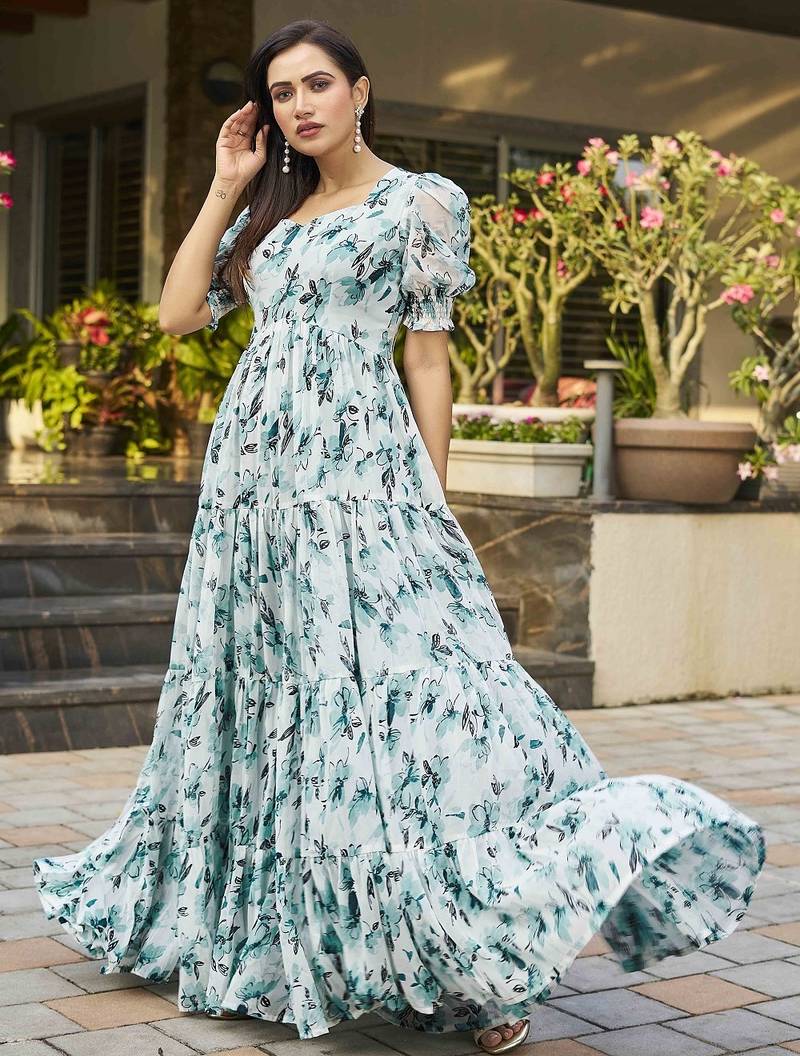 Add A Refreshing Charm To Your Wardrobe With This Elegant Teal Blue Floral Printed Maxi Dress, Designed For Effortless Grace And Everyday Comfort. Made From Lightweight, Breathable Fabric, This Dress Features A Beautifully Tiered Flared Silhouette That Creates A Graceful Flow With Every Movement. The Delicate Floral Print In Soothing Tones Enhances Its Feminine Appeal, Making It Ideal For Daytime Outings, Casual Gatherings, Brunches, Vacations, And Summer Occasions. Styled With A Flattering Square Neckline And Short Puff Sleeves, It Offers A Modern Yet Timeless Look. The Gathered Waistline Provides A Comfortable Fit While Accentuating The Silhouette Naturally. Pair This Dress With Minimal Accessories And Sandals Or Ethnic Flats For A Chic And Relaxed Look Suitable For Both Casual And Semi Festive Wear.