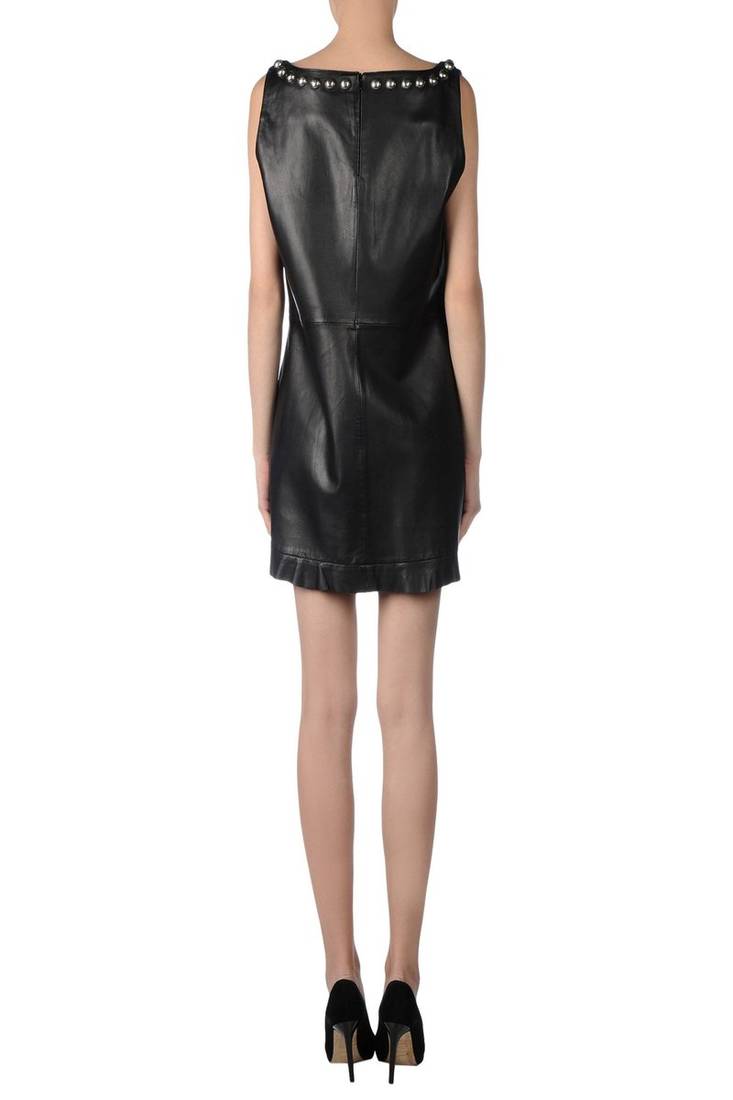| Product Name | Women’s Black Lambskin Leather Dress Sleeveless A Line Dress With Studded Neck Detail | |