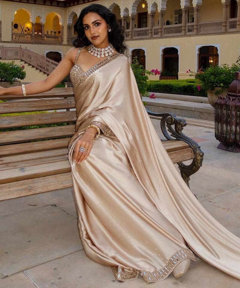 | Product Description | Shine At Your Next Gala In This Beige Satin Saree. The Lightweight Silk Blend Fabric Offers Effortless Elegance, Beautifully Paired With A Heavily Embellished Blouse. Featuring Exquisite Mirror Work And Delicate Embroidery Along The Borders, This Ensemble Captures The Essence Of Luxury And Traditional Craftsmanship. |
