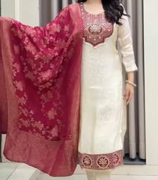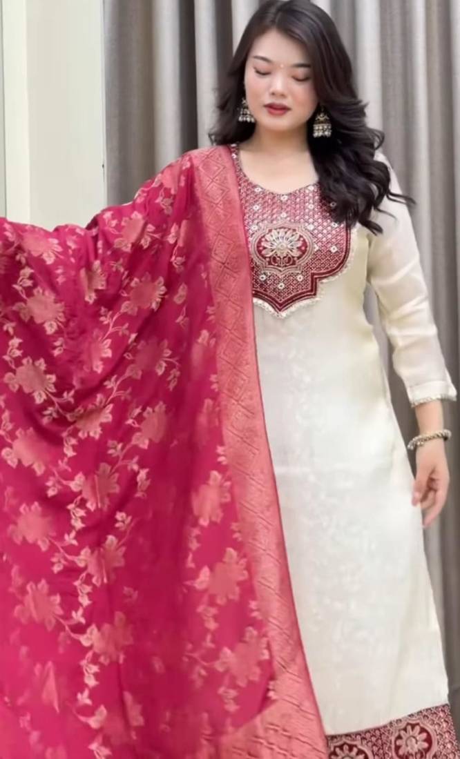Cream banarasisilk embroidered kurta set stitched