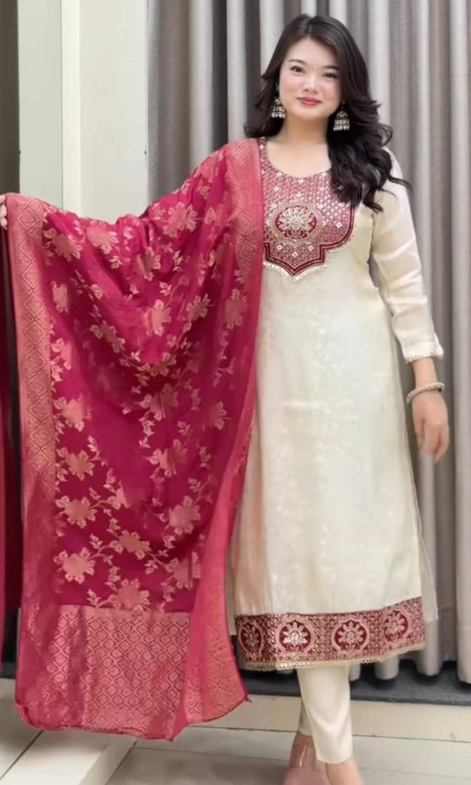 | Product Description | This Classic Cream Suit Combines Tradition With Luxury. The Tunic Is Adorned With A Detailed Maroon And Gold Embroidered Neckline, Mirrored By A Matching Border At The Hem. Paired With A Vibrant Maroon Floral Dupatta, This Silk Blend Ensemble Provides A Polished And Timeless Look For Festive Family Gatherings. |