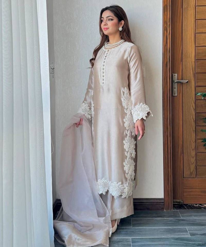 | Product Description | Embrace Understated Glamour In This Cream Suit. The High Gloss Silk Blend Fabric Is Elevated By Bold, White Floral Lace Appliqués Along The Hem And Side Slits. With A Sheer Organza Dupatta And Straight Leg Trousers, This Outfit Is Perfect For Refined Daytime Social Events And Formal Celebratory Dinners. |