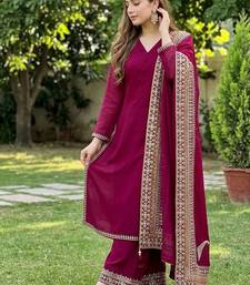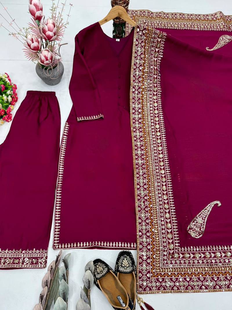 | Product Description | Sophistication Meets Simplicity In This Deep Plum Purple Suite. The Solid Toned Kurti Features A Classic V Neckline, Allowing The Focus To Remain On The Richly Embroidered Dupatta. With Geometric Gold Threadwork And Tassel Accents, This Ensemble Offers A Refined, Polished Look For Evening Soirées And Formal Cultural Gatherings. |