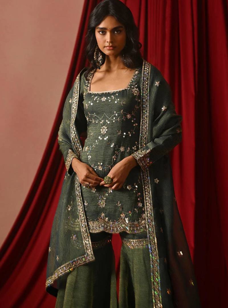 | Product Description | Make A Grand Entrance In This Green Sharara Set. The Short Tunic Features Intricate Mirror Work And Sequin Vines, Paired With Matching Flared Sharara Pants. Crafted From A Premium Silk Blend, The Ensemble Is Completed By A Shimmering Dupatta, Offering A Sophisticated And Regal Look For Weddings Or High End Evening Celebrations. |