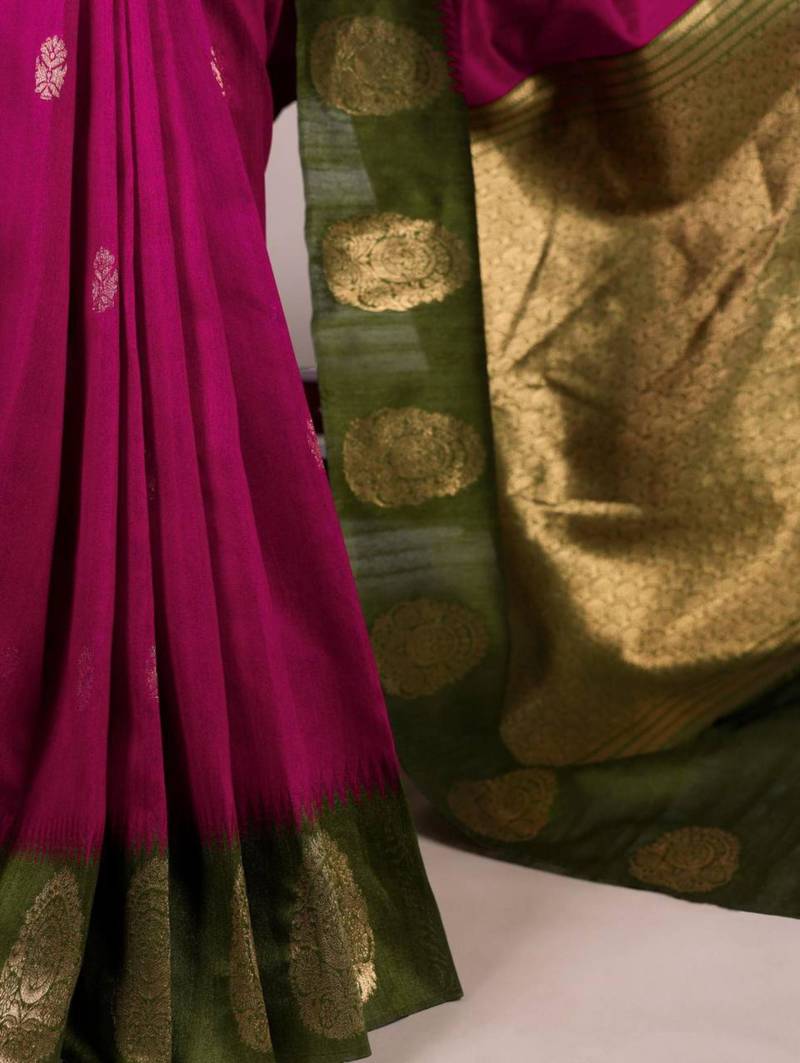 | Product Description | Immerse Yourself In Tradition With This Exquisite Magenta Poly Cotton Saree. Featuring A Contrasting Olive Green Border Adorned With Intricate Gold Zari, This Piece Showcases Classic Indian Craftsmanship. The Lightweight, Breathable Fabric Ensures All Day Comfort, While The Elegant Floral Butti Patterns Make It A Quintessential Choice For Weddings And Festive Celebrations. |