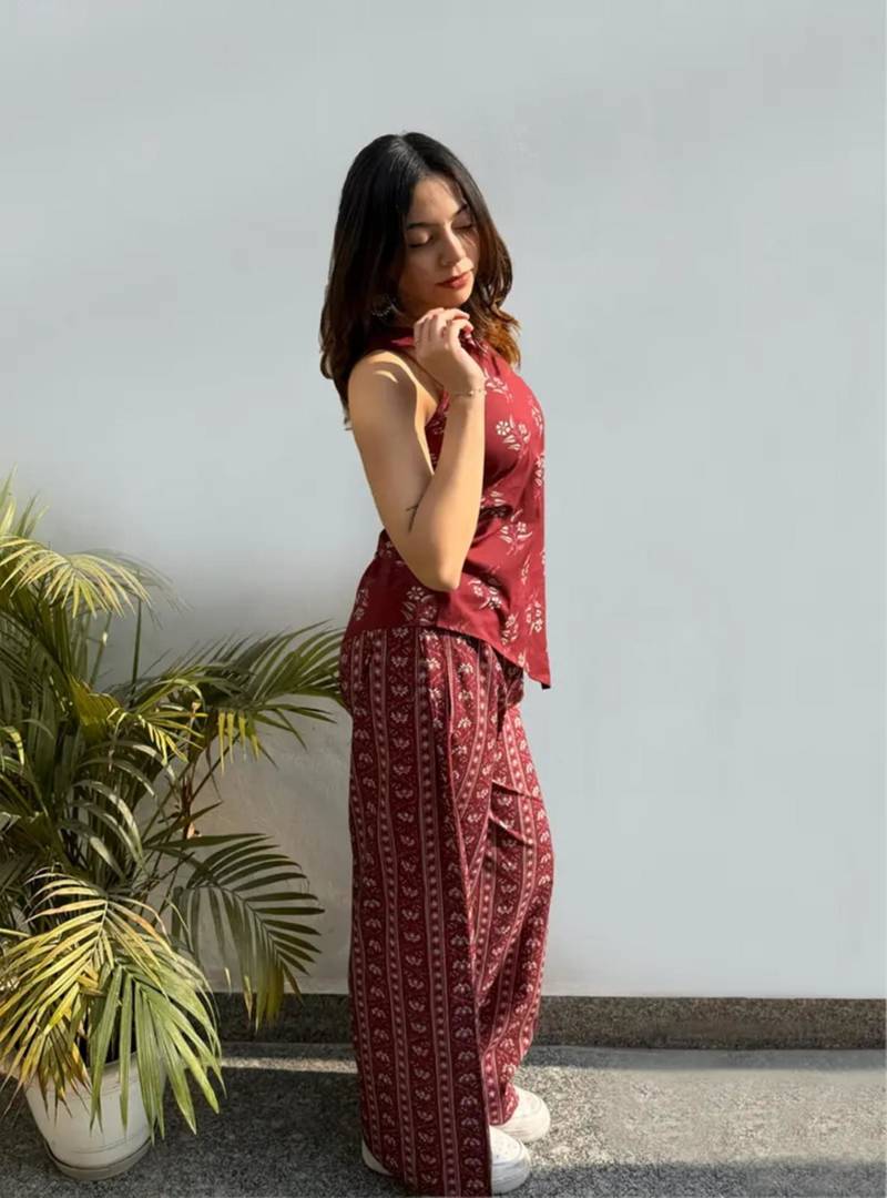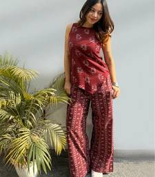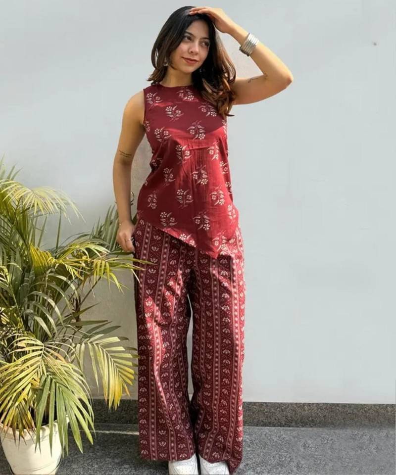 | Product Description | Refresh Your Casual Wardrobe With This Chic Maroon Fusion Set. The Sleeveless Asymmetric Tunic Features Delicate Floral Motifs, Paired Perfectly With Coordinated Vertical Striped Wide Leg Pants. Crafted From A Breathable Cotton Silk Blend, This Outfit Offers A Relaxed Yet Polished Silhouette Ideal For Daytime Outings Or Sophisticated Lounge Wear. |