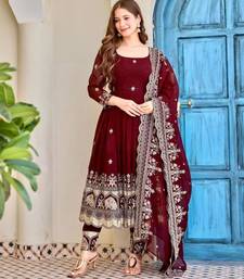 Elevate Your Evening Style With This Burgundy Maroon Anarkali Set. The Deep Wine Hue Is Complemented By Intricate Gold Embroidery Along The Sleeve Cuffs And Hemline. Paired With Matching Slim Fit Trousers And A Sheer Dupatta, This Silk Blend Ensemble Offers A Refined And Regal Look For Gala Dinners And Weddings.