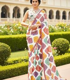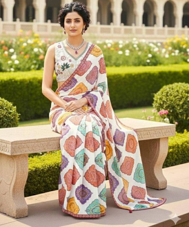| Product Description | Discover Artistic Elegance With This Multicolor Saree Featuring Bold, Multi Colored Geometric Prints. The Vibrant Hues Of Saffron, Purple, And Teal Create A Stunning Visual Contrast Against The Pristine Base. Paired With A Meticulously Embroidered Floral Blouse, This Chic Outfit Is Perfect For Brunch, Cultural Events, Or Spring Festivities. |