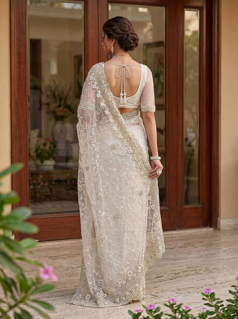 Off white net embroidered saree