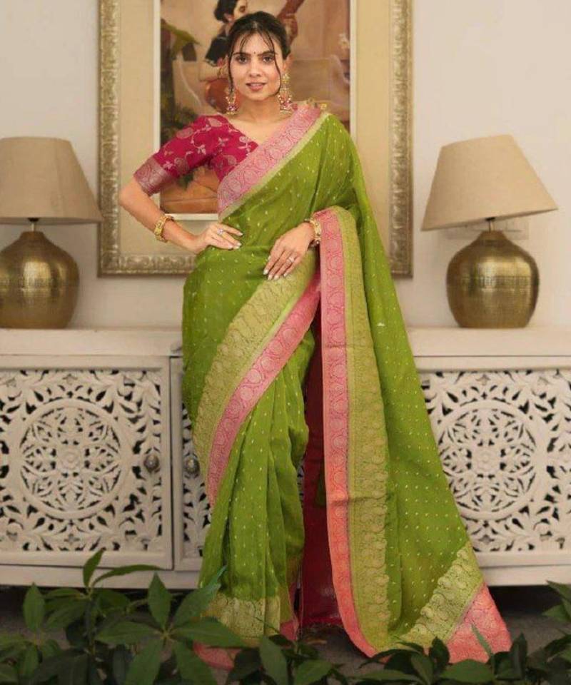 | Product Description | This Olive Silk Blend Saree Strikes The Perfect Balance Between Tradition And Modern Style. It Features A Rich Pink And Gold Zari Border That Adds A Vibrant Pop Of Color. The Breathable Fabric And Subtle Sheen Make It An Ideal Choice For Sophisticated Formal Events And Traditional Festivities. |