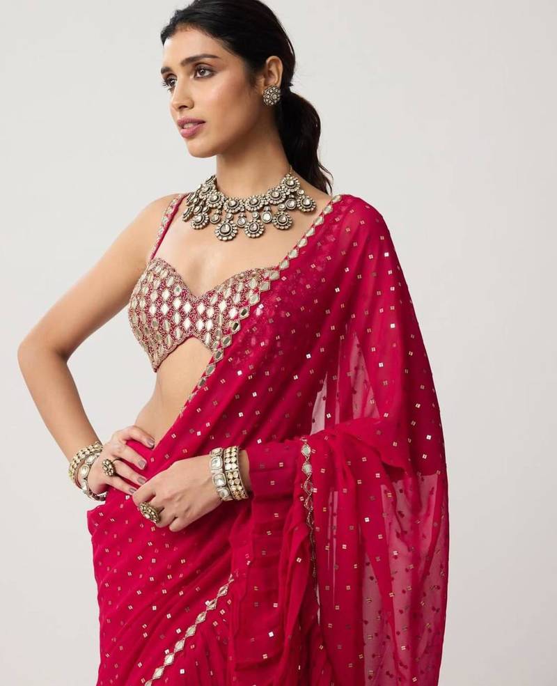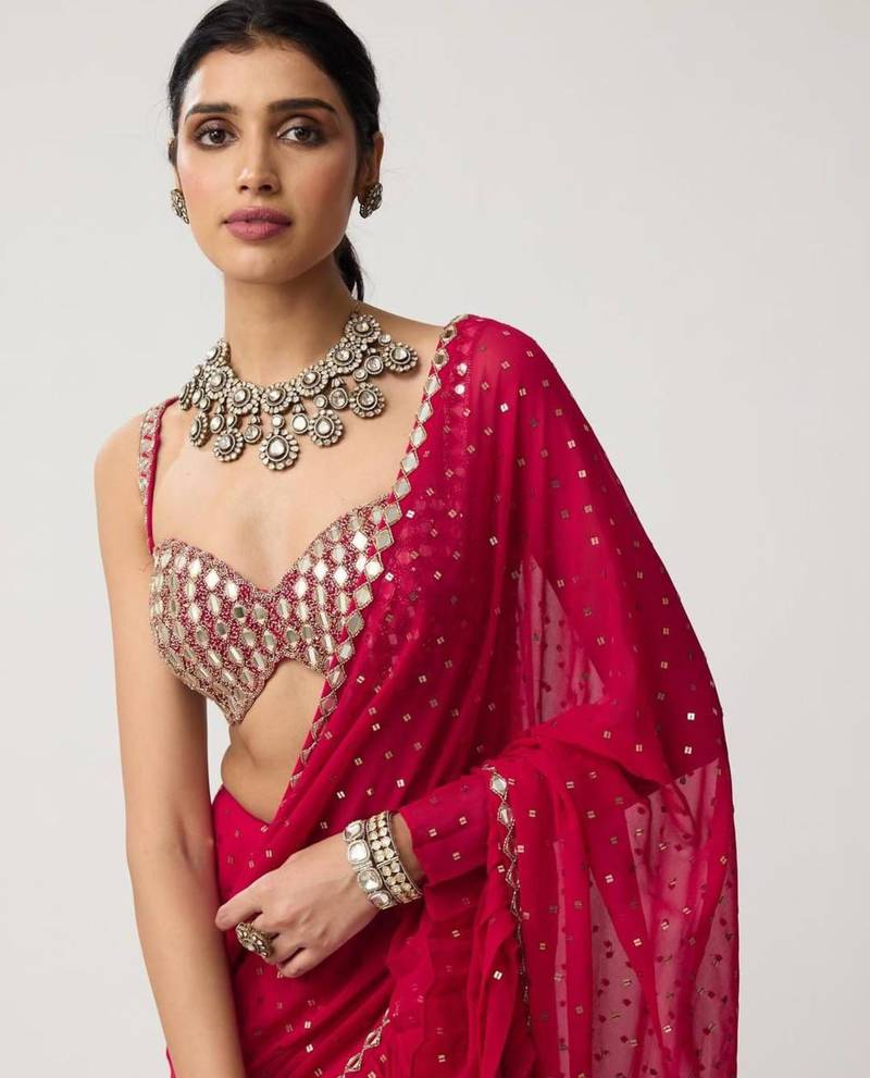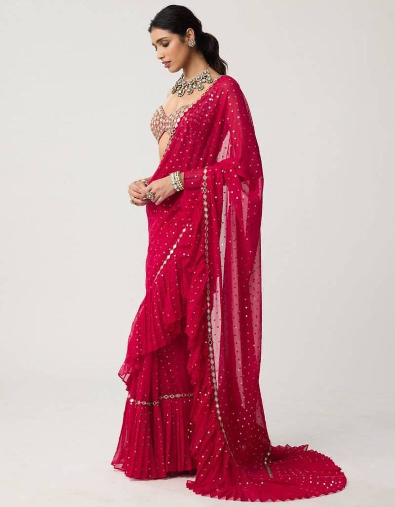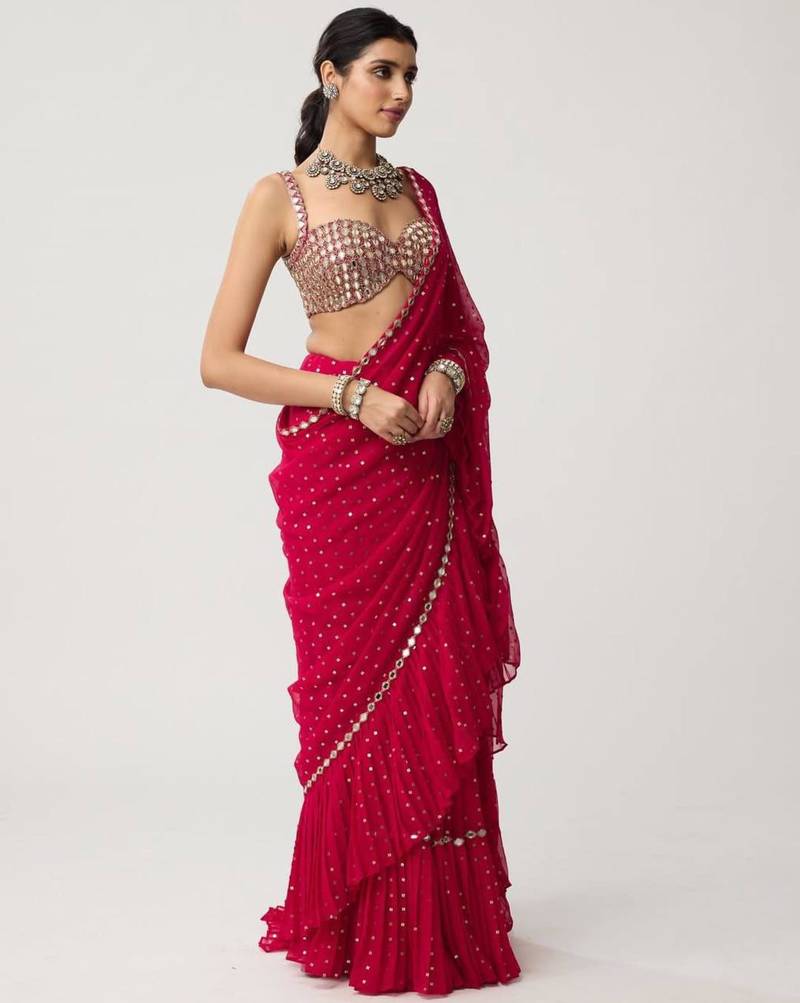 | Product Description | Make A Playful Statement In This Vibrant Pink Saree. Featuring Contemporary Tiered Ruffles And Delicate Silver Sequin Accents, It Offers A Dynamic, High Fashion Silhouette. The Look Is Completed With A Heavily Embellished Mirror Work Bustier, Making It The Ultimate Outfit For Sangeet Ceremonies And Festive Parties. |