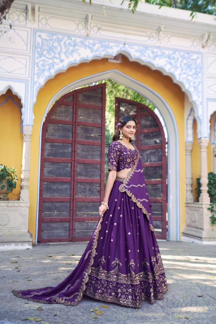 | Product Description | Embrace Regal Sophistication In This Purple Lehenga Set. The Skirt And Matching Dupatta Are Adorned With Delicate Gold Toned Vine Embroidery That Flows Gracefully With Every Movement. Featuring A Coordinated Embroidered Blouse, This High Quality Ensemble Is Perfect For Evening Wedding Receptions And Formal Cultural Celebrations. |
