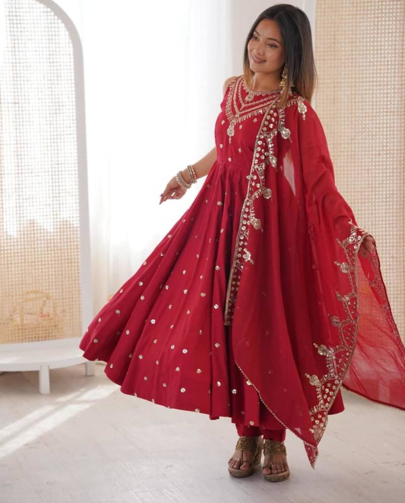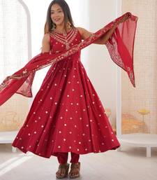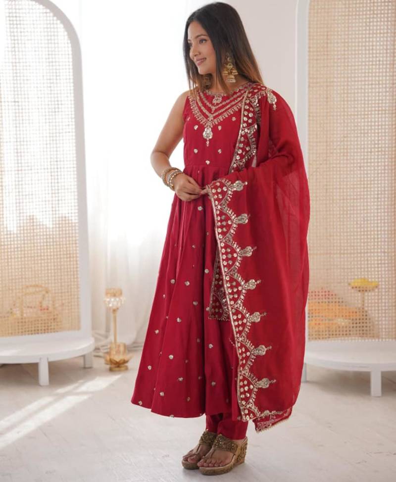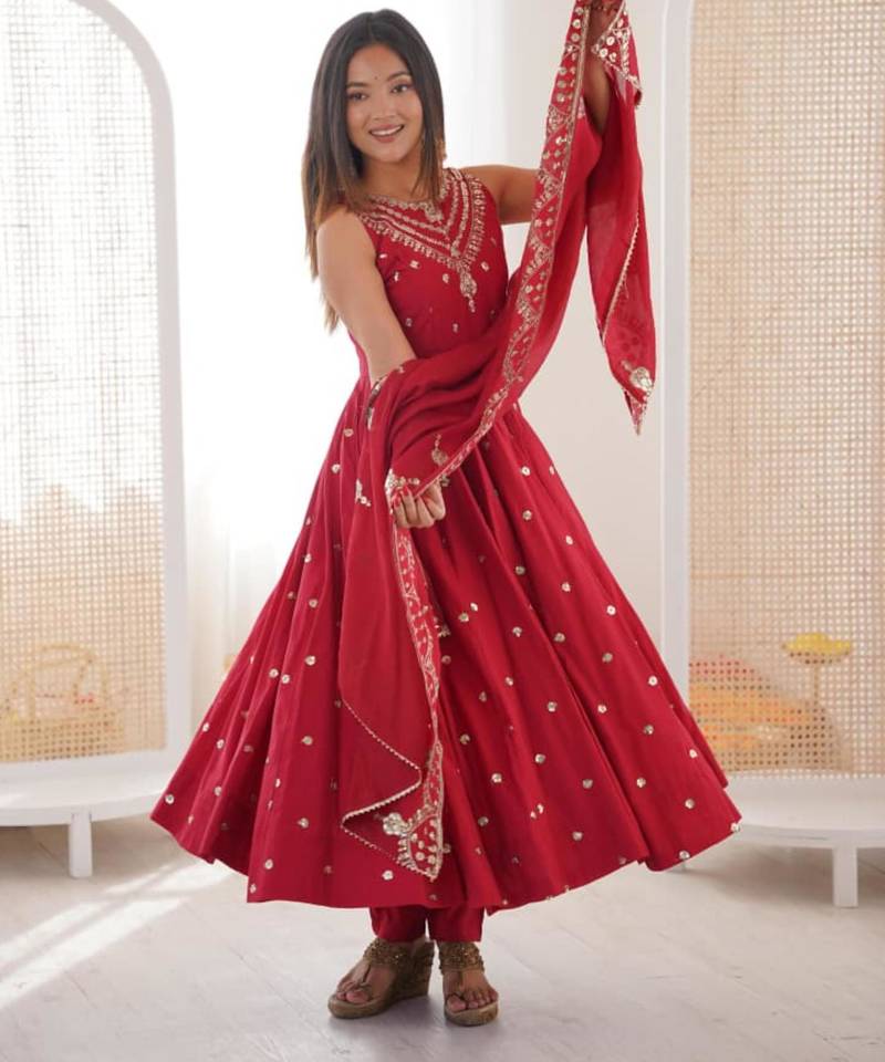 | Product Description | Celebrate In Style With This Rich Ruby Red Anarkali. The Outfit Features A Meticulously Embroidered Neckline And Scattered Sequin Work That Adds A Festive Glow. Finished With A Beautiful Scalloped Edge Dupatta, This Premium Silk Blend Suit Is The Ultimate Choice For Bridal Festivities And Traditional Holiday Celebrations |