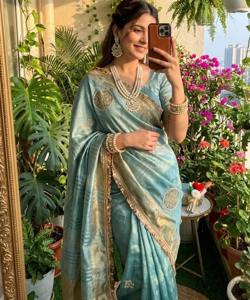 | Product Name | Sky Blue Satin Embroidered Saree | |