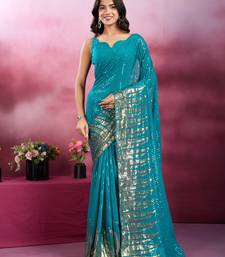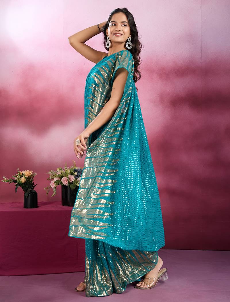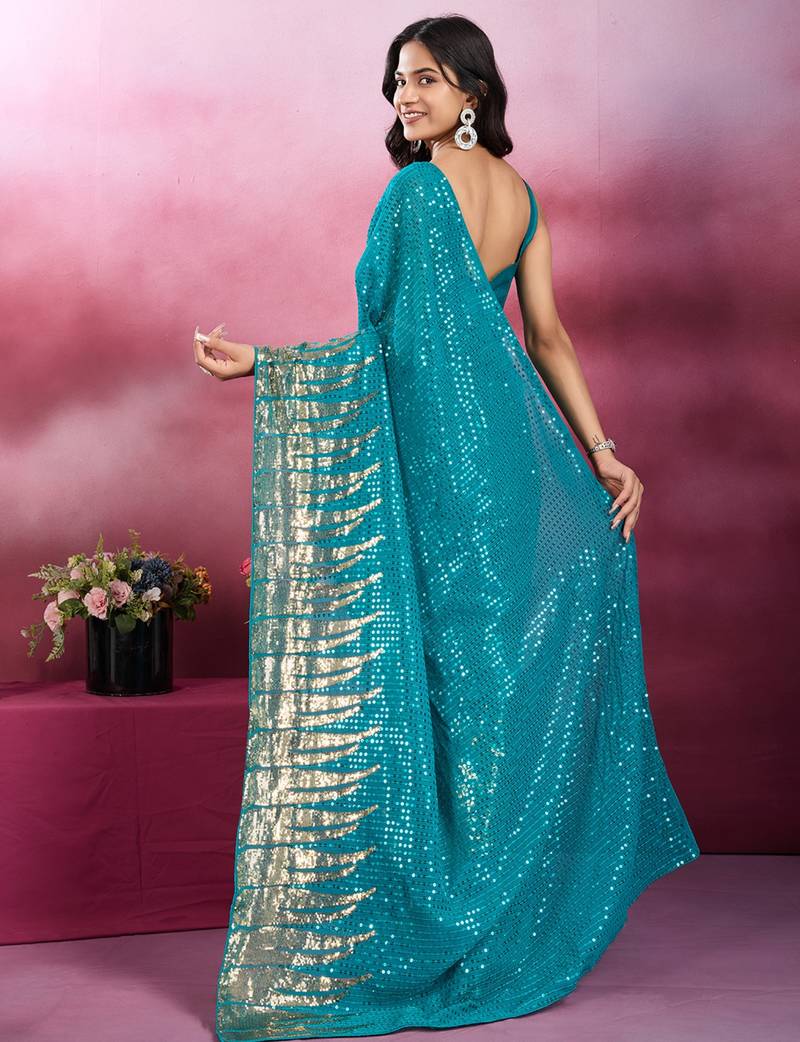 Rama and gold sequins embroidered georgette party wear saree with blouse piece