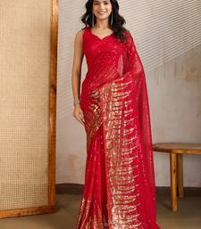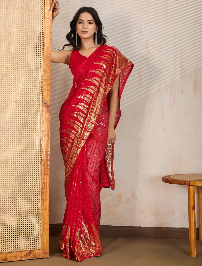 Red and gold sequins embroidered georgette party wear saree with blouse piece