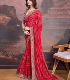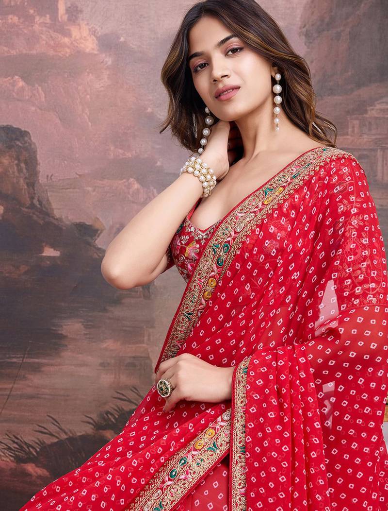 | Product Name | Red Bandhani Printed Georgette Saree With Multi Color Embroidered Border And Blouse Piece | |
