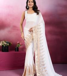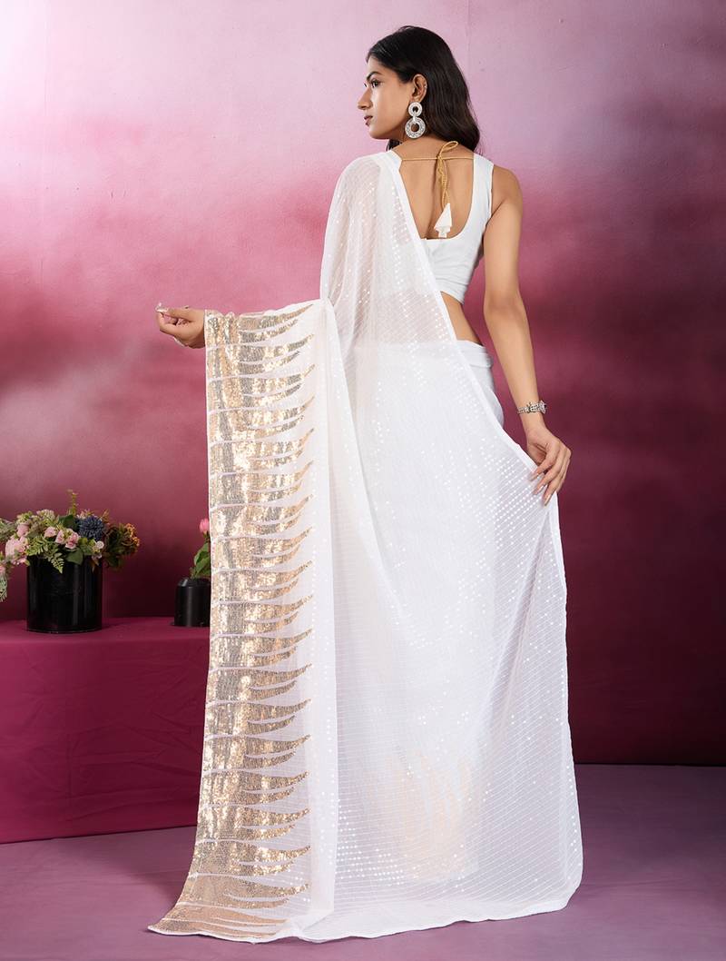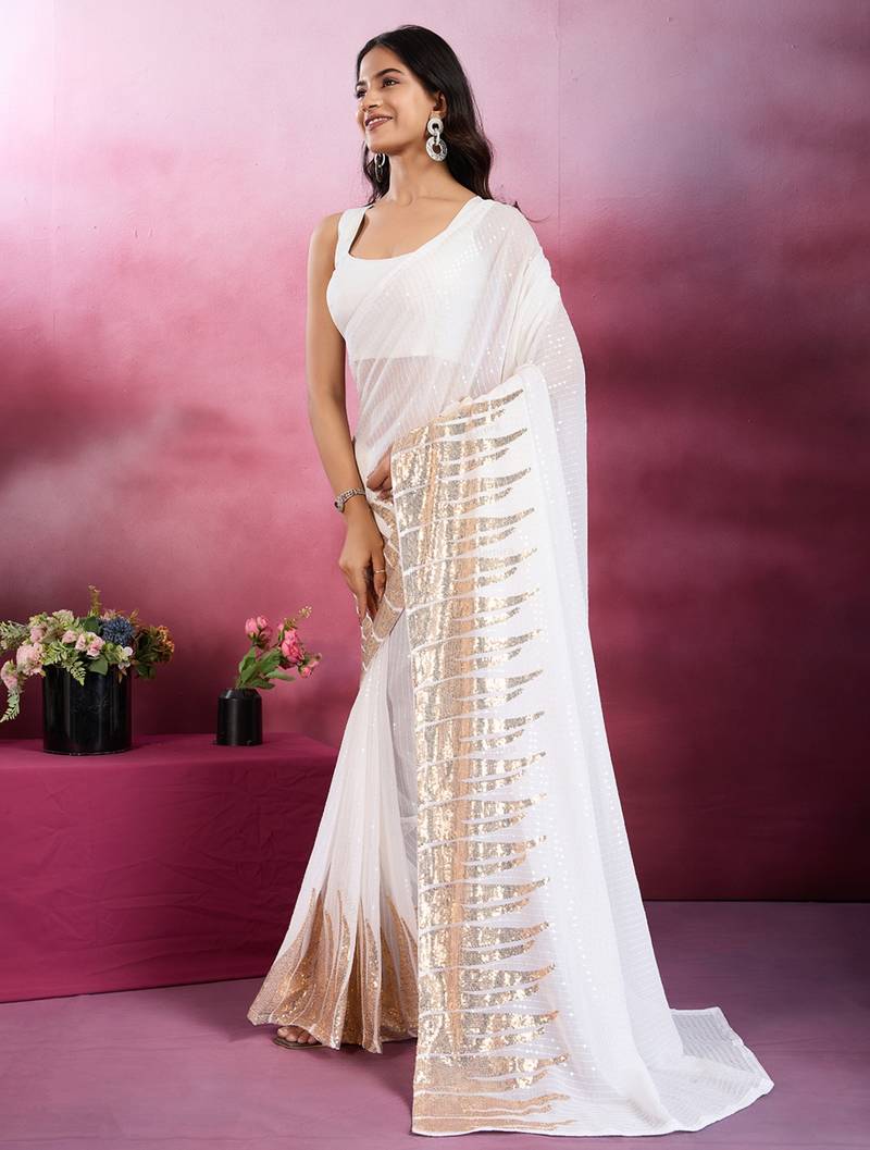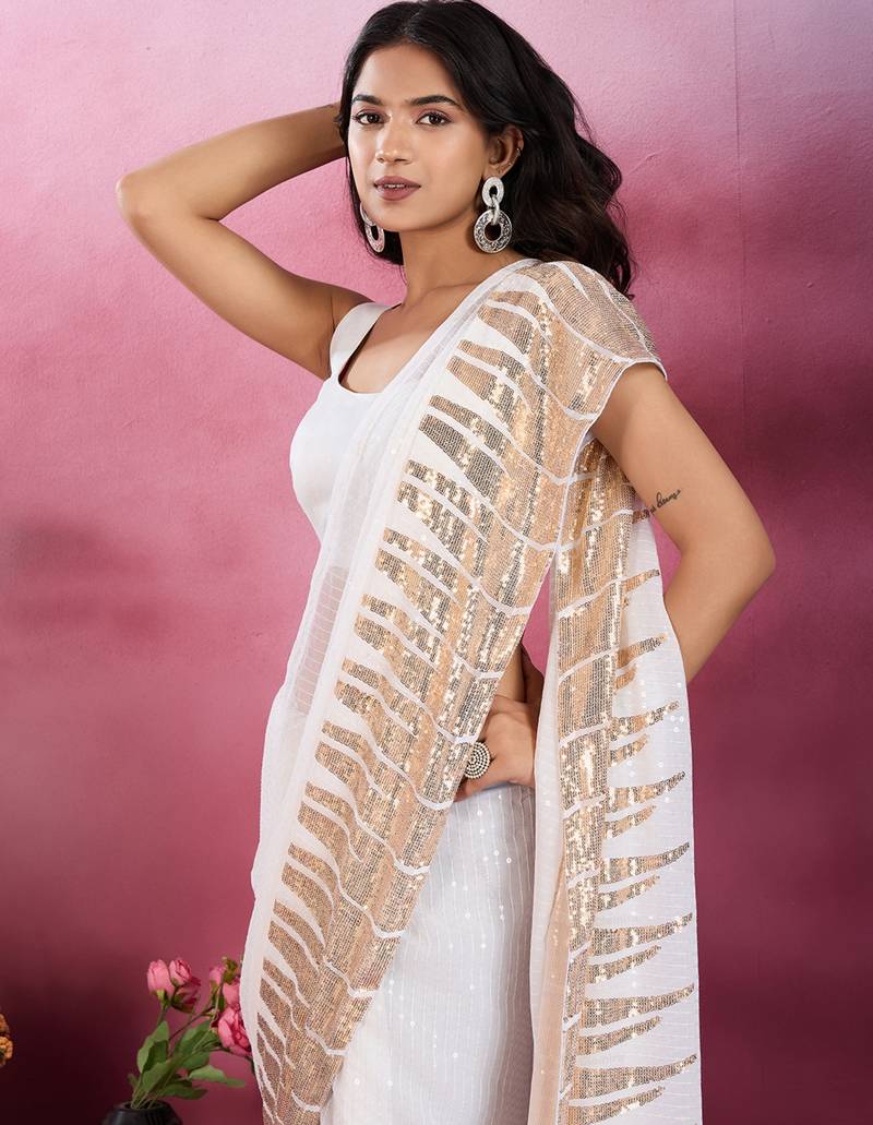 White and gold sequins embroidered georgette party wear saree with blouse piece