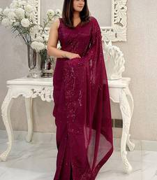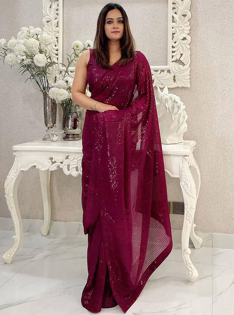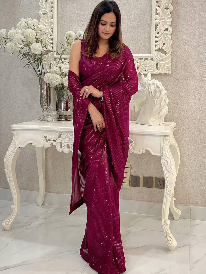 Wine all-over sequins striped georgette party wear saree with blouse piece