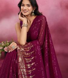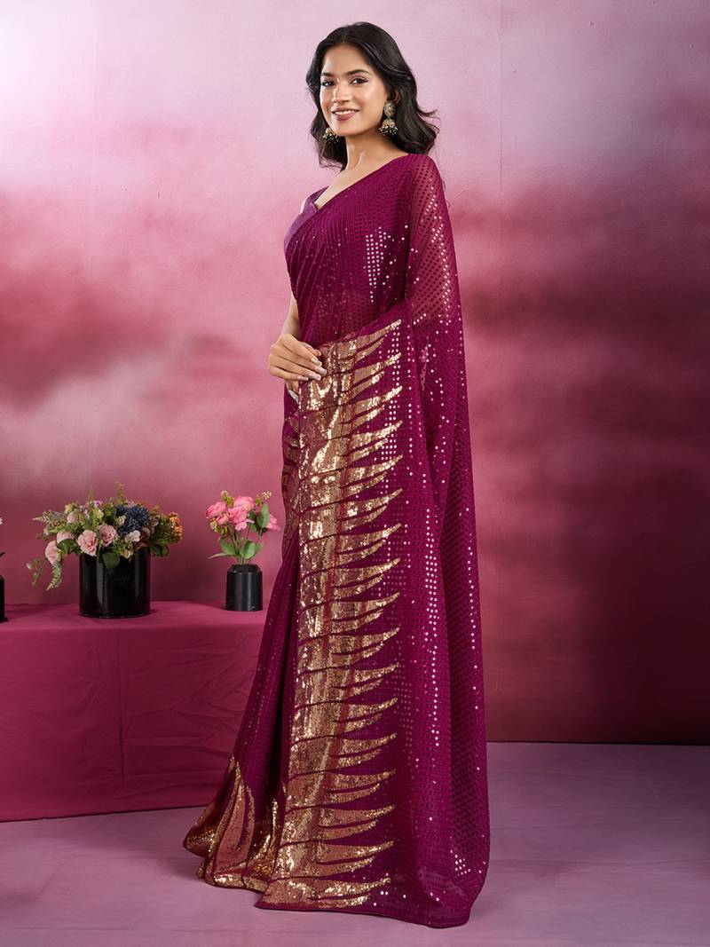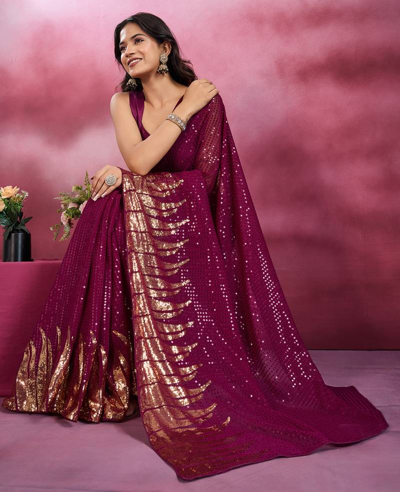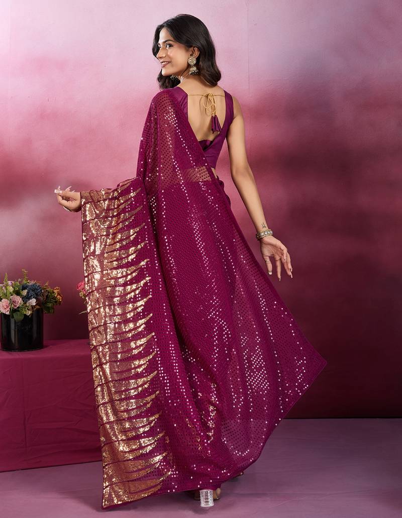 Wine and gold sequins embroidered georgette party wear saree with blouse piece